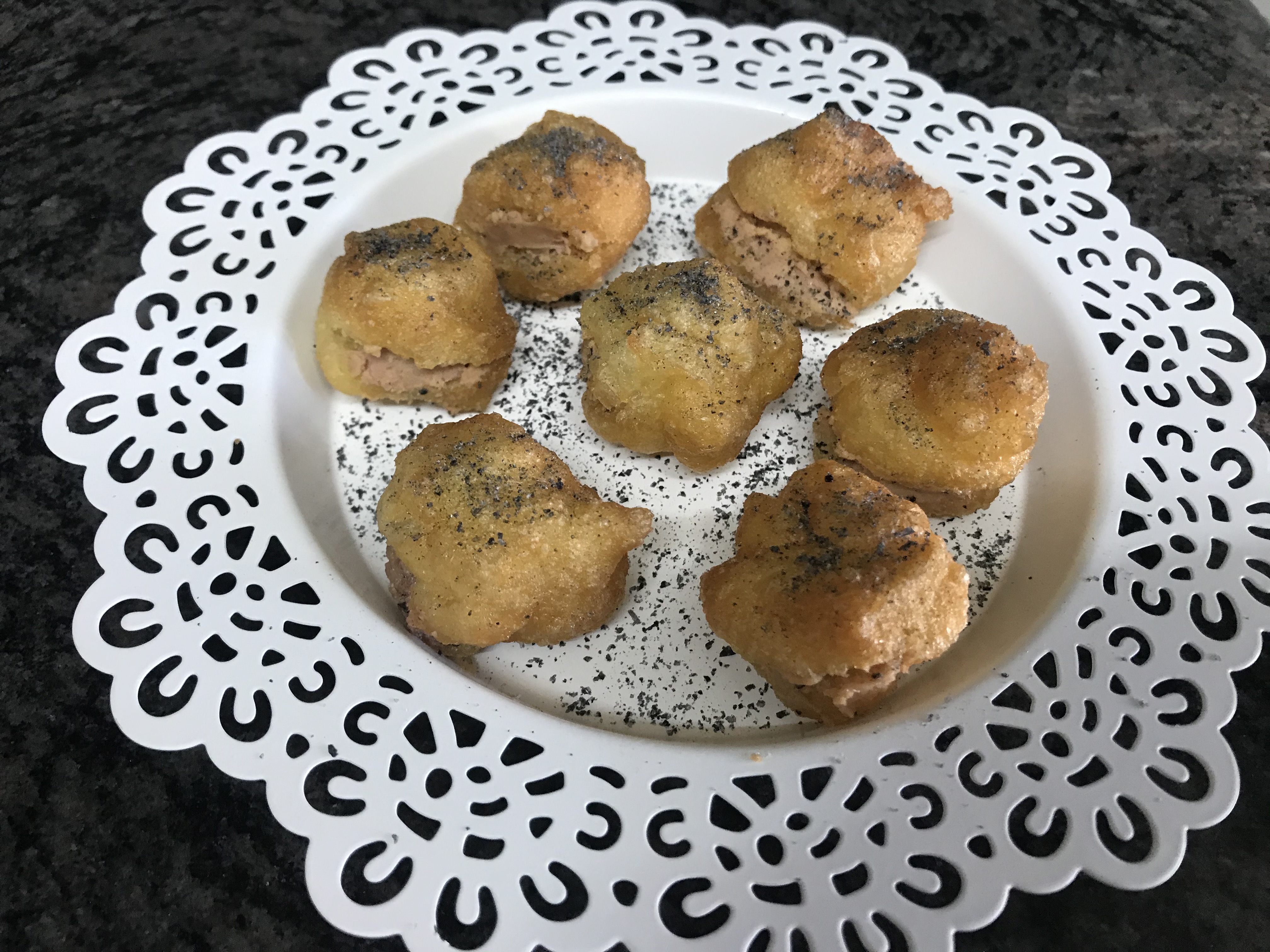 BUNYOLS DE VENT FARCITS AMB FOIE TRUFAT I ESPOLVOREJATS AMB SAL NEGRA DE XIPRE