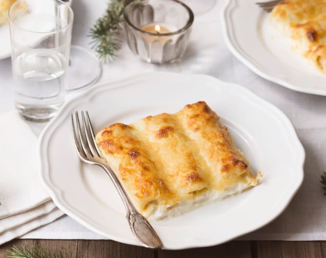 Escurra las placas de canelones y extiéndalas sobre un paño de cocina. Con la manga pastelera, haga cilindros de Ø 2 cm en un extremo de cada placa y enróllelas. Coloque los canelones en la fuente preparada y reserve.