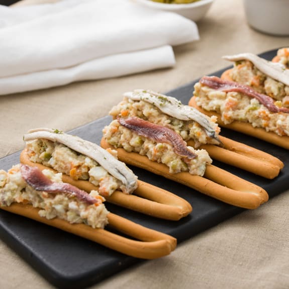 Justo antes de servir, ponga 2 cucharadas de ensaladilla sobre un lado de cada rosquilleta de colin dejando un extremo libre para cogerla (Bicicleta). Coloque sobre 8 rosquilletas una anchoa encima (Marinera) y sobre otras 8, 1 boquerón en vinagre (Marinero). Sirva inmediatamente.