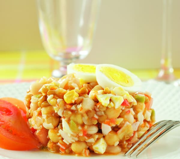 Mezcle en una ensaladera las legumbres cocidas, lavadas y escurridas. Incorpore los dados de tomate y los huevos duros.