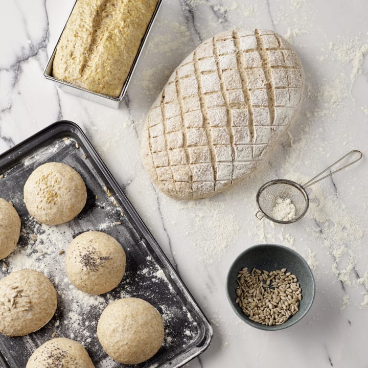 Si tienes la masa preparada en la nevera, hacer pan para el desayuno es una solución sencilla y rápida. Puedes guardar la masa con la mitad de la cantidad de levadura en la nevera hasta 3 días, envuelta en plástico de envasar transparente previamente aceitado. El pan frío subirá despacio, y tendrá incluso mejor sabor. Saca la masa que necesites para la mañana (unos 50 g por cada bollito de pan). Con las manos cubiertas de harina, amasa los bollitos suavemente, aireando la masa lo más posible, y déjala que suba un poco mientras precalientas el horno a 180-200 ºC. Luego, hornea durante 15 a 18 minutos y ¡disfruta del desayuno con tu pan recién horneado!