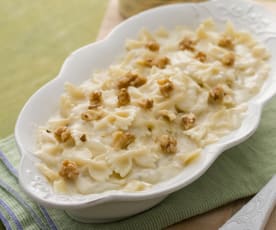 Ponga en el vaso la pasta, el queso, las peras, el vino blanco, el agua, la sal y la pimienta y programe 20 min/100°C/giro inverso/vel cuchara. Vierta en una fuente, mezcle con la espátula, espolvoree las nueces y sirva inmediatamente.