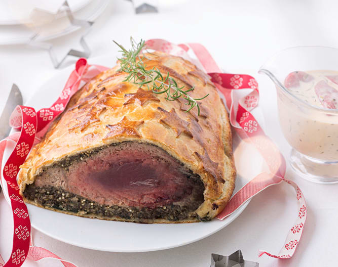 Retire el atún Wellington del horno y deje reposar durante 5 minutos. Corte en raciones y sirva con la salsa de pimientos.