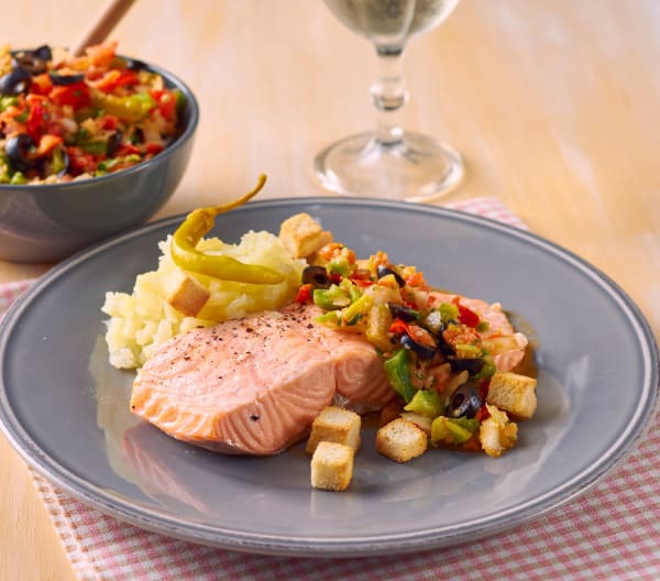 Ponga en el vaso 500 g de agua, introduzca el cestillo con las patatas y programe 15 min/Varoma/vel 1. Mientras tanto, ponga en el recipiente Varoma los lomos de salmón con 2 pellizcos de sal y 1 de pimienta, tape y reserve.