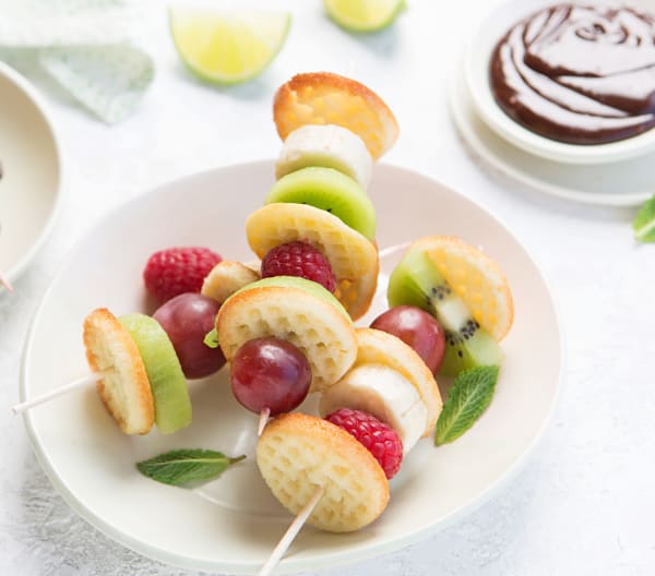 Ponga todos los ingredientes en el vaso y programe 2 min/60°C/vel 3. Retire la salsa a un bol. Monte los pinchos intercalando los gofres mini con las diferentes frutas y sirva acompañados de la salsa.