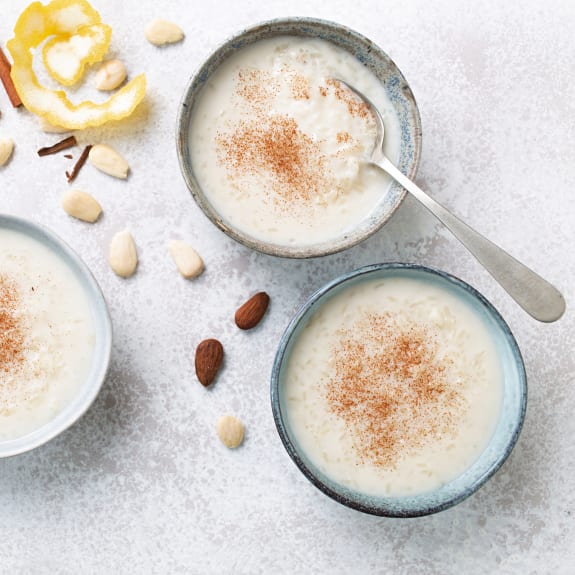 Coloque la mariposa en las cuchillas. Ponga en el vaso el agua, la crema de almendras, la piel de limón, el palo de canela, el arroz, el azúcar y la sal. Programe 50 min/90°C/vel 1. Retire la mariposa. Vierta el arroz en una fuente o en boles individuales, retire las pieles de limón y el palo de canela y déjelo enfriar. Sirva el arroz espolvoreado con canela molida.