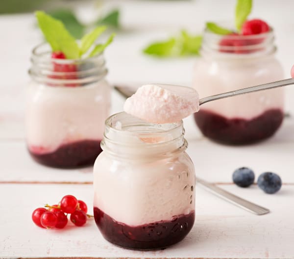 Ponga en el fondo de cada tarro 2 cucharaditas de mermelada y, vierta la mezcla del vaso interponiendo una cuchara para que no se mezcle. Coloque los tarros en el centro del recipiente Varoma. Tape los tarros con sus tapas y tape el Varoma.
