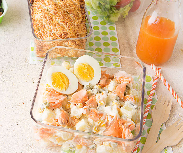 Prepare cada lunch-box con: 1 ración de ensaladilla, ½ huevo duro, 2-3 tomates cherry, 2 hojas de lechuga picada, 1 tarro con el zumo casero, 2-3 ciruelas pasas, 4-6 almendras y el hojaldre de pera con chocolate.