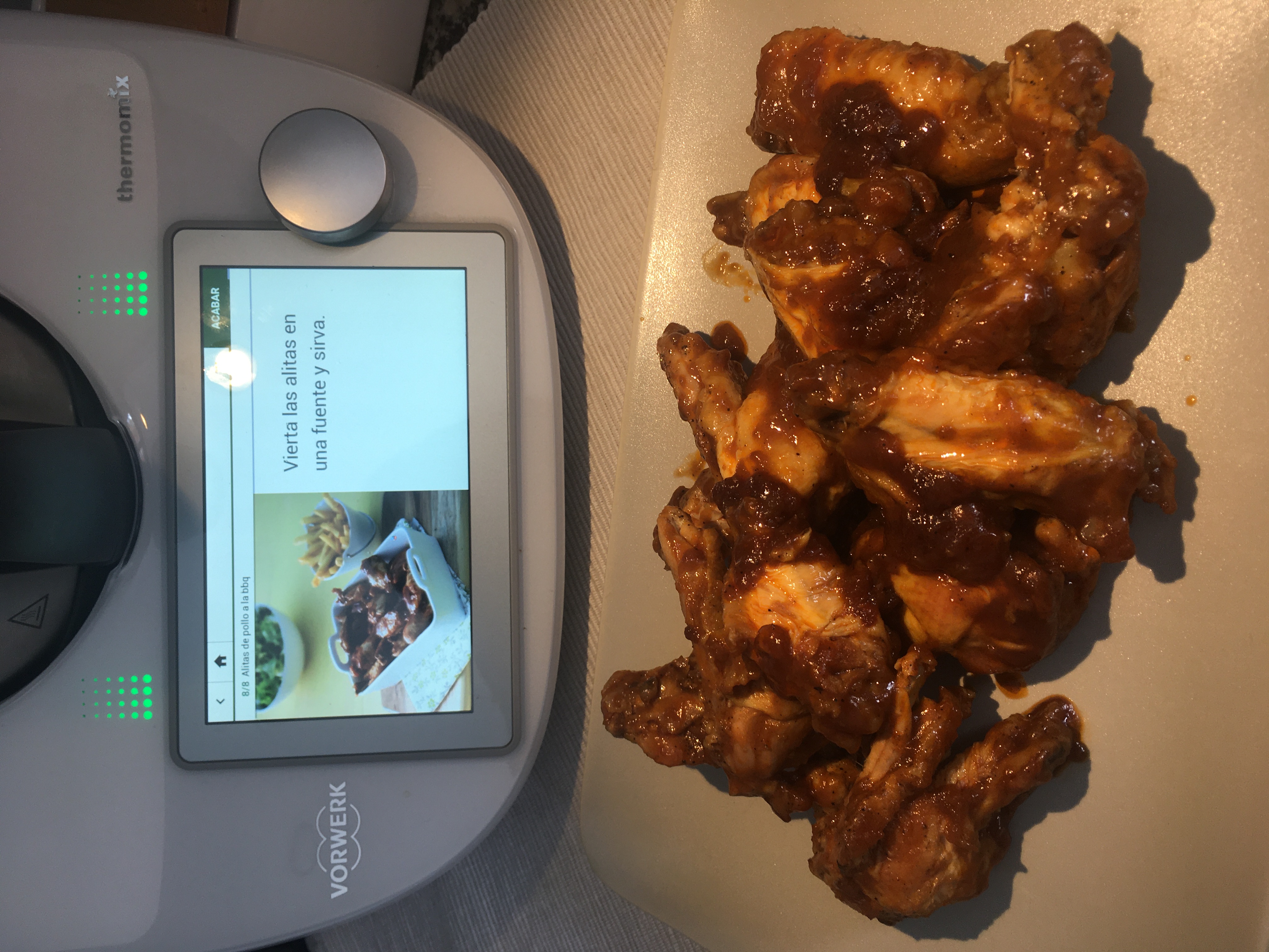 - Ponga en el vaso las alitas, el aceite, la salsa barbacoa, el agua y la maicena. Programe 30min/varoma/giro inverso/vel.cuchara. Vierta las alitas en una fuente y sirva.