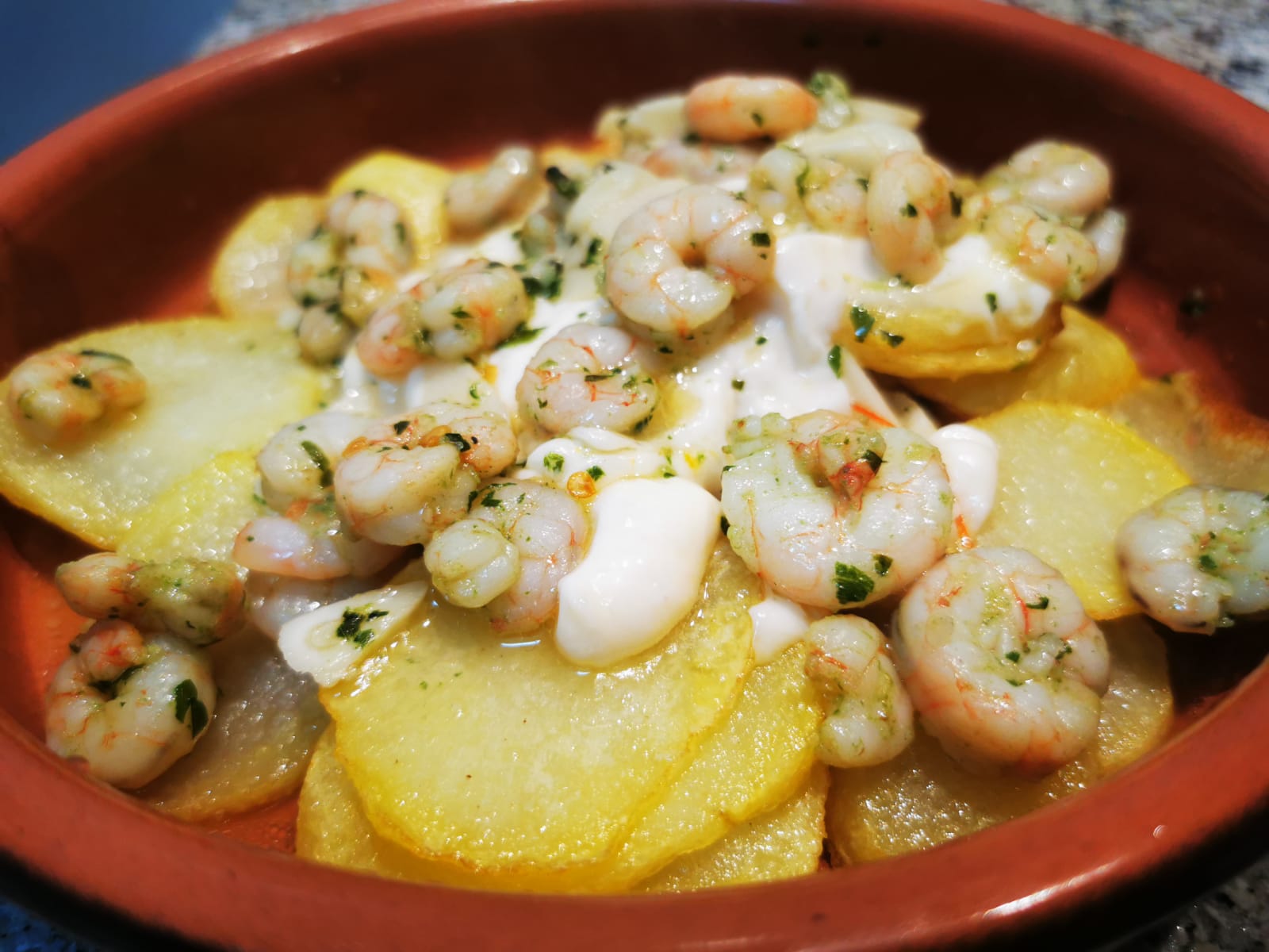 - Freír las patatas panaderas, servir por encima las gambitas con su jugo, que cale las patatas y cubrir con la ajonesa.