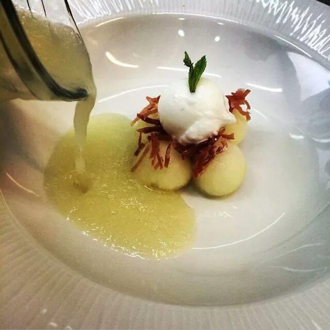 Hago unas bolas de melón y las pongo en el centro de un plato hondo, encima le pongo una bola de helado de nata o de yogur y lo espolvoreo con unas virutas de jamón. Para terminar, le añado la sopa con cuidado para no desmontar el plato.