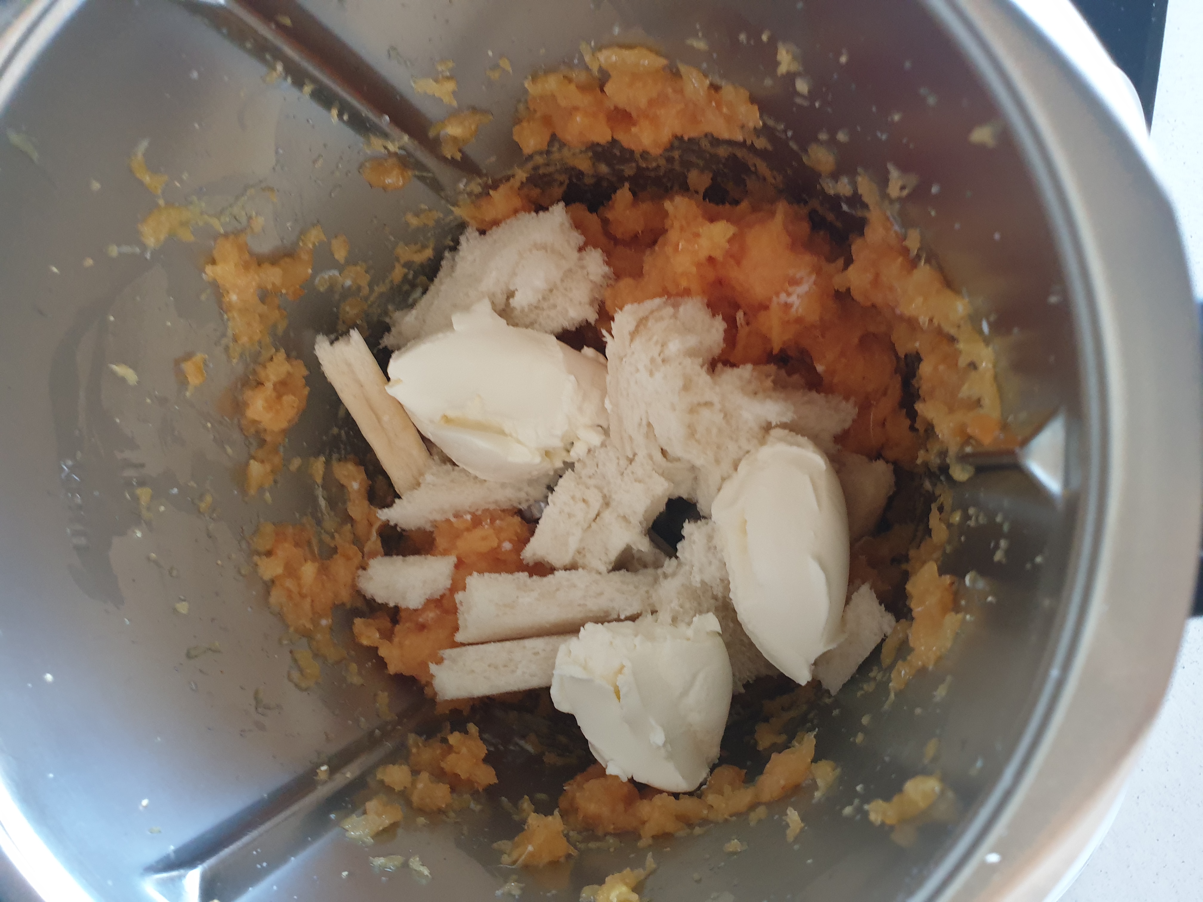 2. Añada el pan, el queso y la leche y mezcle 10 seg/vel 7