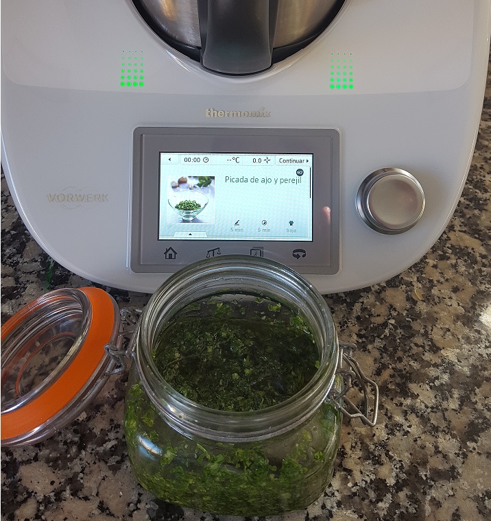 La gran ventaja de hacerla con nuestro Thermomix, es que no tendremos que pasarnos rato y rato picando el perejil y el ajo a cuchillo, dejándonos las muñecas y llevándonos algún que otro corte.