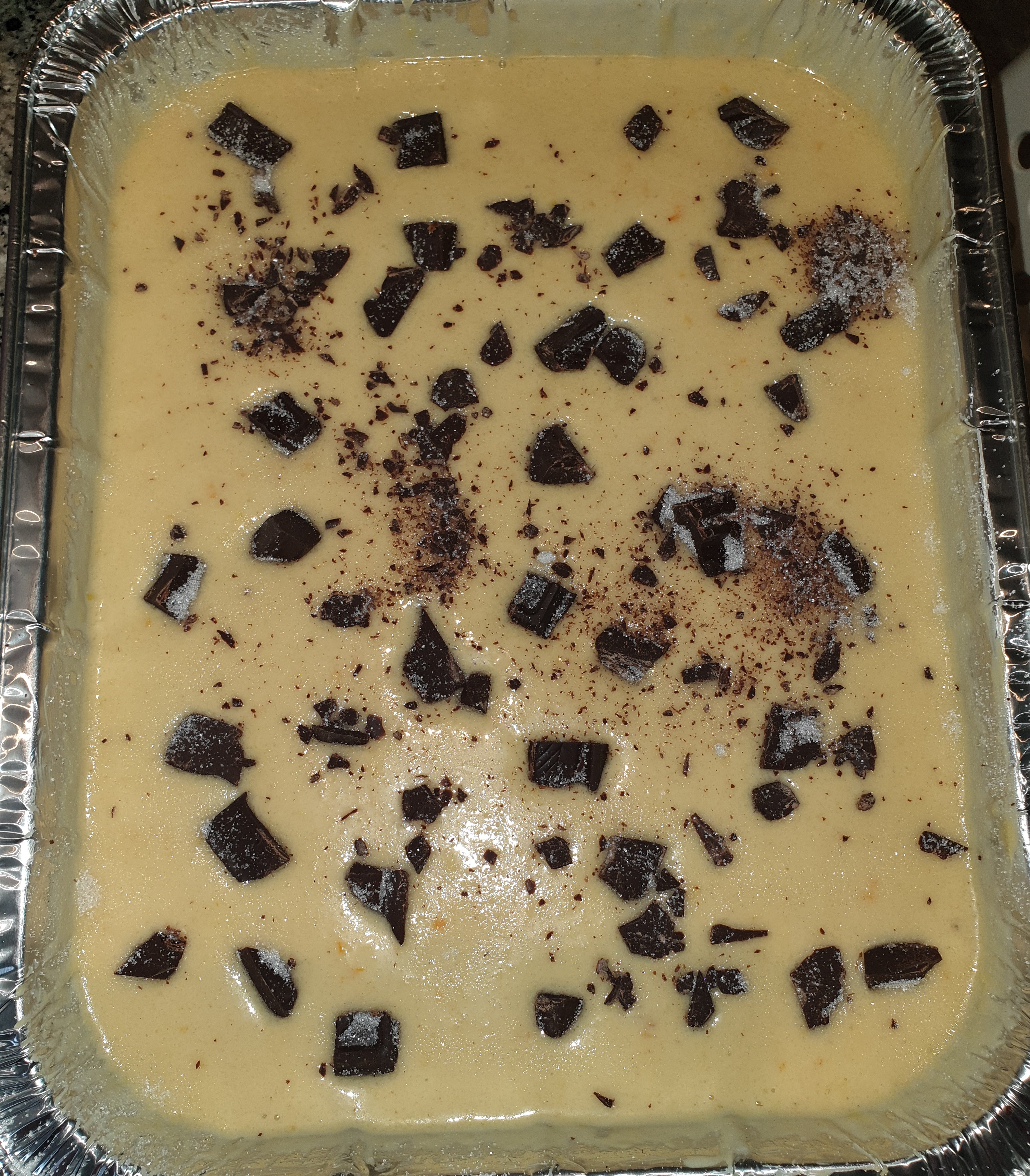 Vierta la masa en la bandeja preparada, distribuya encima los trozos de chocolate y espolvoree con azúcar. Hornee durante 35-40 minutos (180°C). Retire del horno y deje templar. Corte en porciones y sirva.