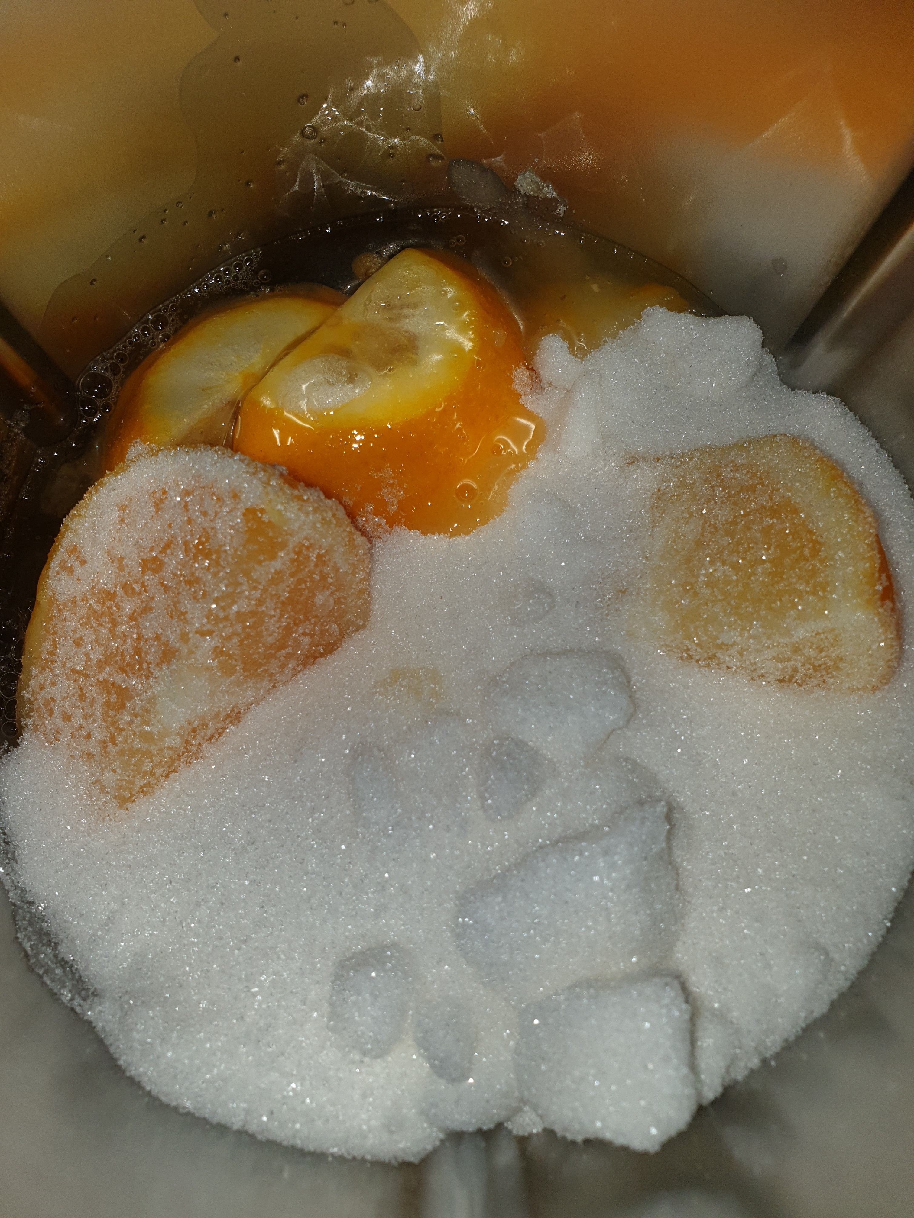 - Ponga en el vaso el azúcar, la naranja y los huevos. Triture 3 min/37°C/vel 5.