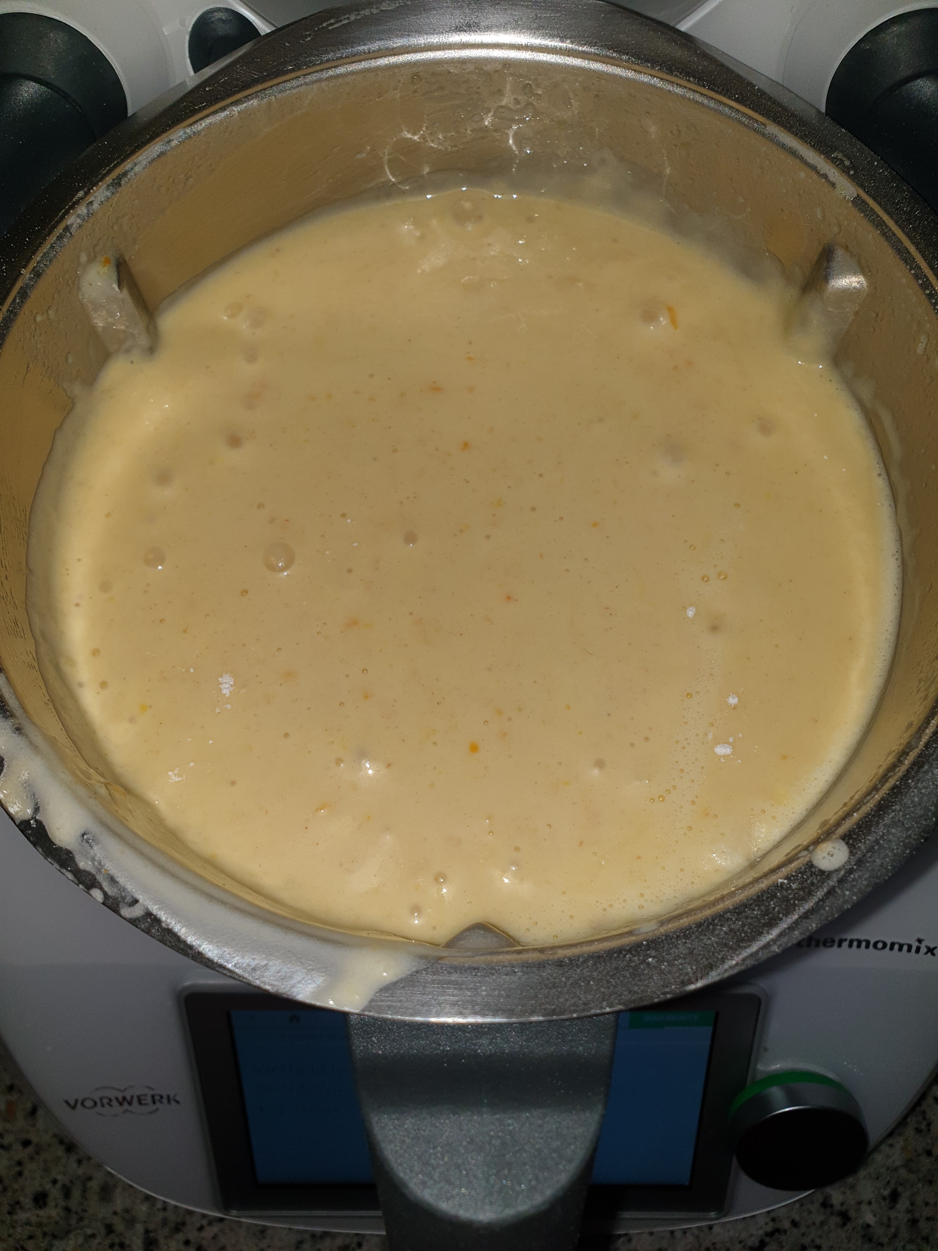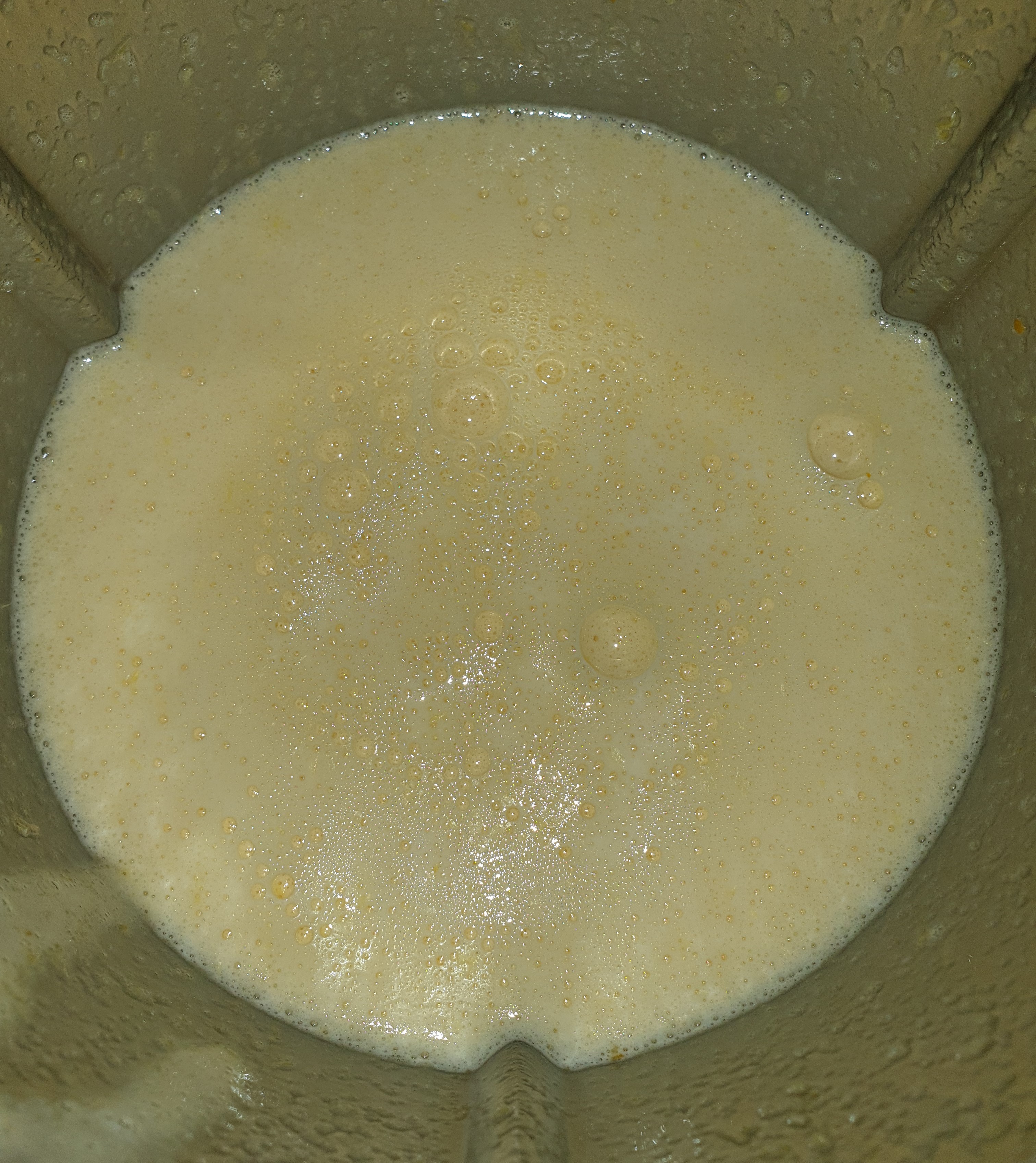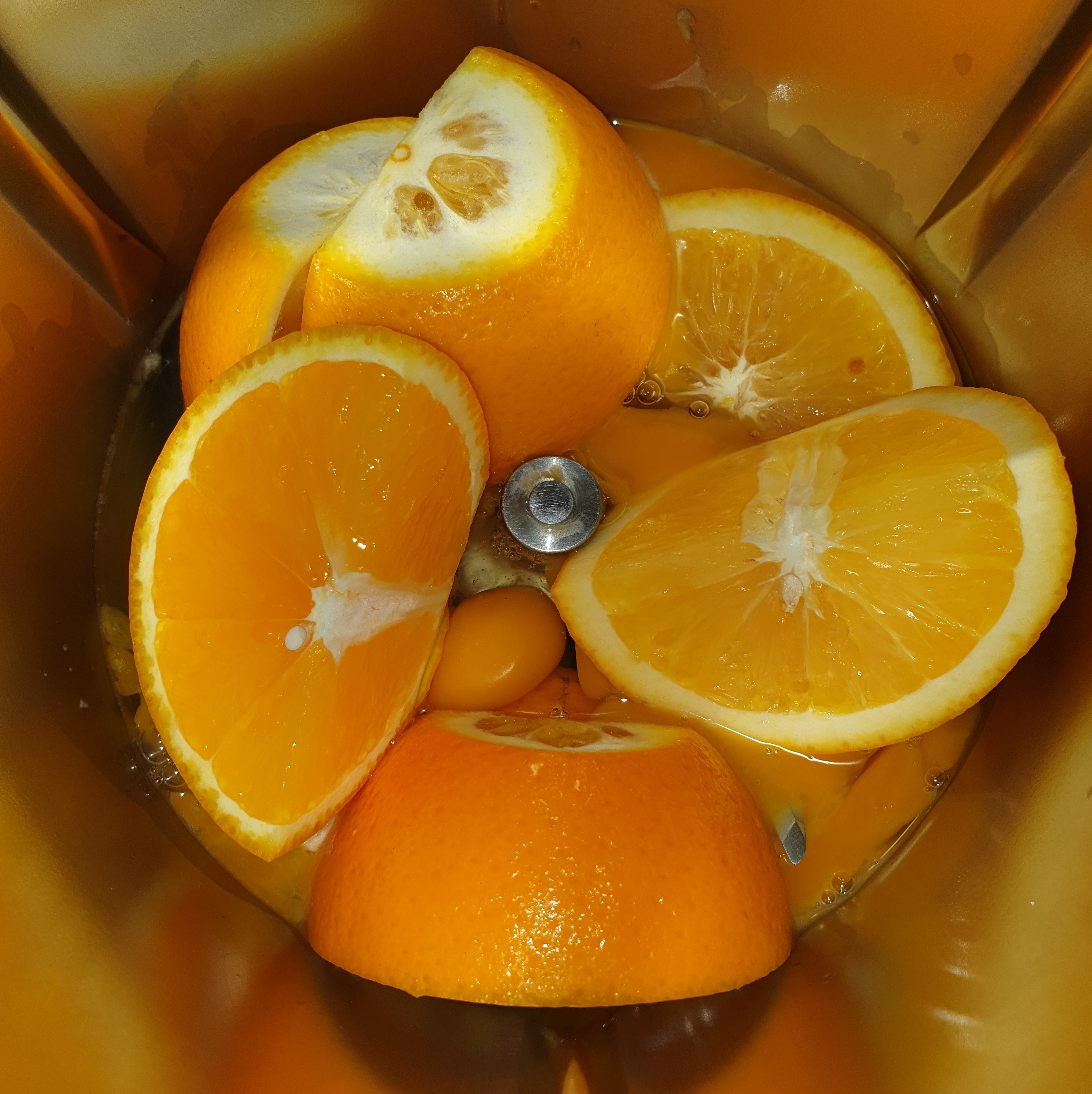- Ponga en el vaso los huevos, las naranjas y el azúcar y triture 5 min/37°C/vel 5. Con la espátula, baje los ingredientes hacia el fondo del vaso.