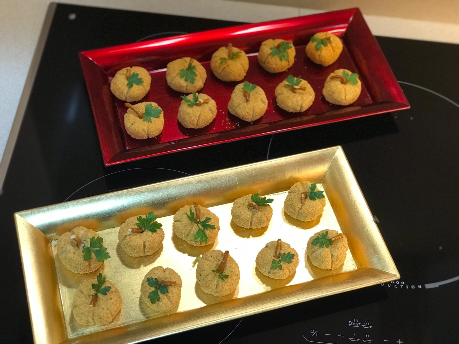- Con una cuchara, tome una porción de la crema de queso. Reboce con los nachos triturados y termine de darle forma de bola. Coloque las bolas en una bandeja hágales unas hendiduras presionando con un palillo imitando la calabaza y conserve en el frigorífico.