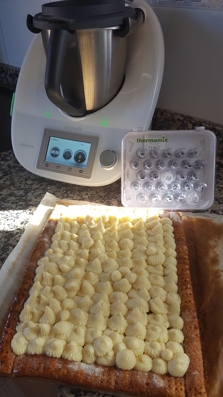 - Ponga en el vaso la leche, el azúcar, la harina, el azúcar vainillado y los huevos batidos reservados y programe 7 min/90ºC/vel 4. Vierta la crema sobre la tartaleta horneada. O bien, podéis ponerla en una manga pastelera y usarla cuando esté fría con una boquilla de estrella.