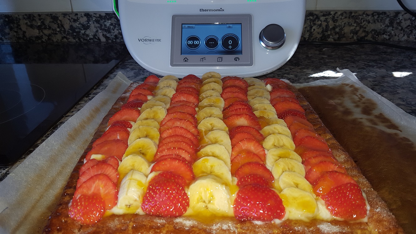 - Coloque las frutas sobre la crema de forma decorativa. Pincele la tarta con la mermelada cubriendo bien las frutas y reserve en el frigorífico hasta el momento de servir.