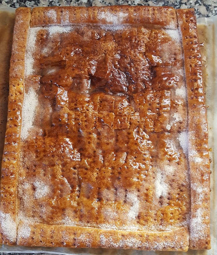 - Corte dos tiras de masa de 2 cm de ancho a lo largo y otras dos a lo ancho. Humedezca, con el dedo mojado en agua, los bordes del rectángulo de masa y pegue encima de cada uno las tiras para formar un borde más alto. Coloque la masa en la bandeja preparadam pinche con un tenedor el centro de la masa y pincélela con un poco del huevo batido reservado. Yo en vez de pincelarla con huevo, la baño en azúcar moreno y esta vez con azúcar blanco porqué no tenía moreno. Así consigo que quede crujiente. Pero podéis hacerlo de las dos maneras. Al gusto.