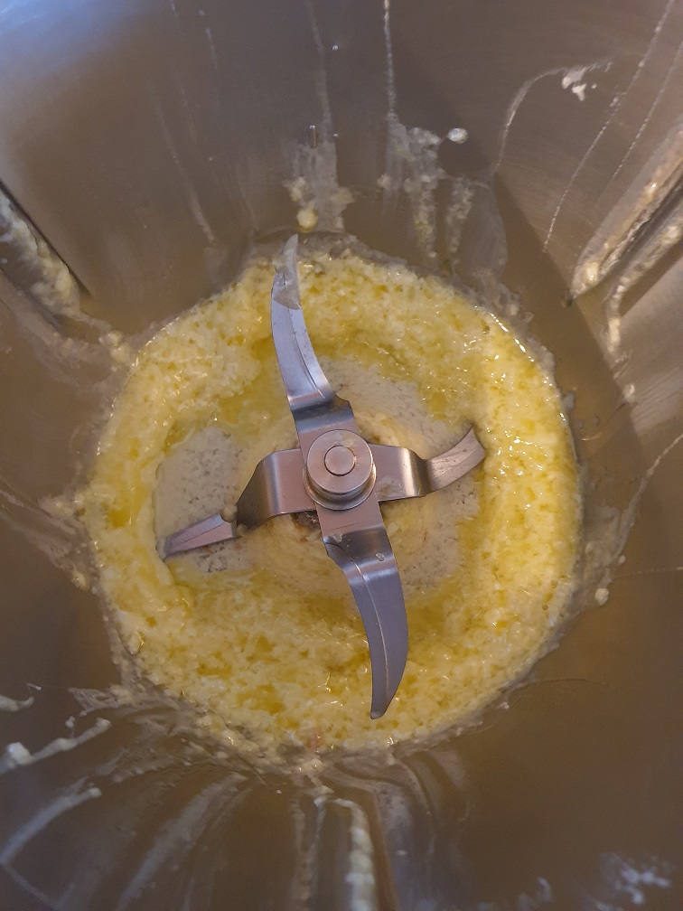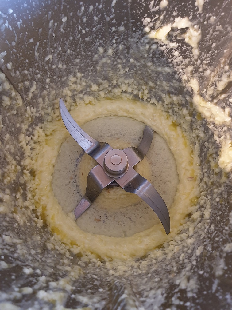 - Con la espátula, baje la mezcla hacia el fondo del vaso. Compruebe que están completamente triturados los ajos, si no es así, triture de nuevo, 1 min/vel 7. Debe quedar como una pasta.