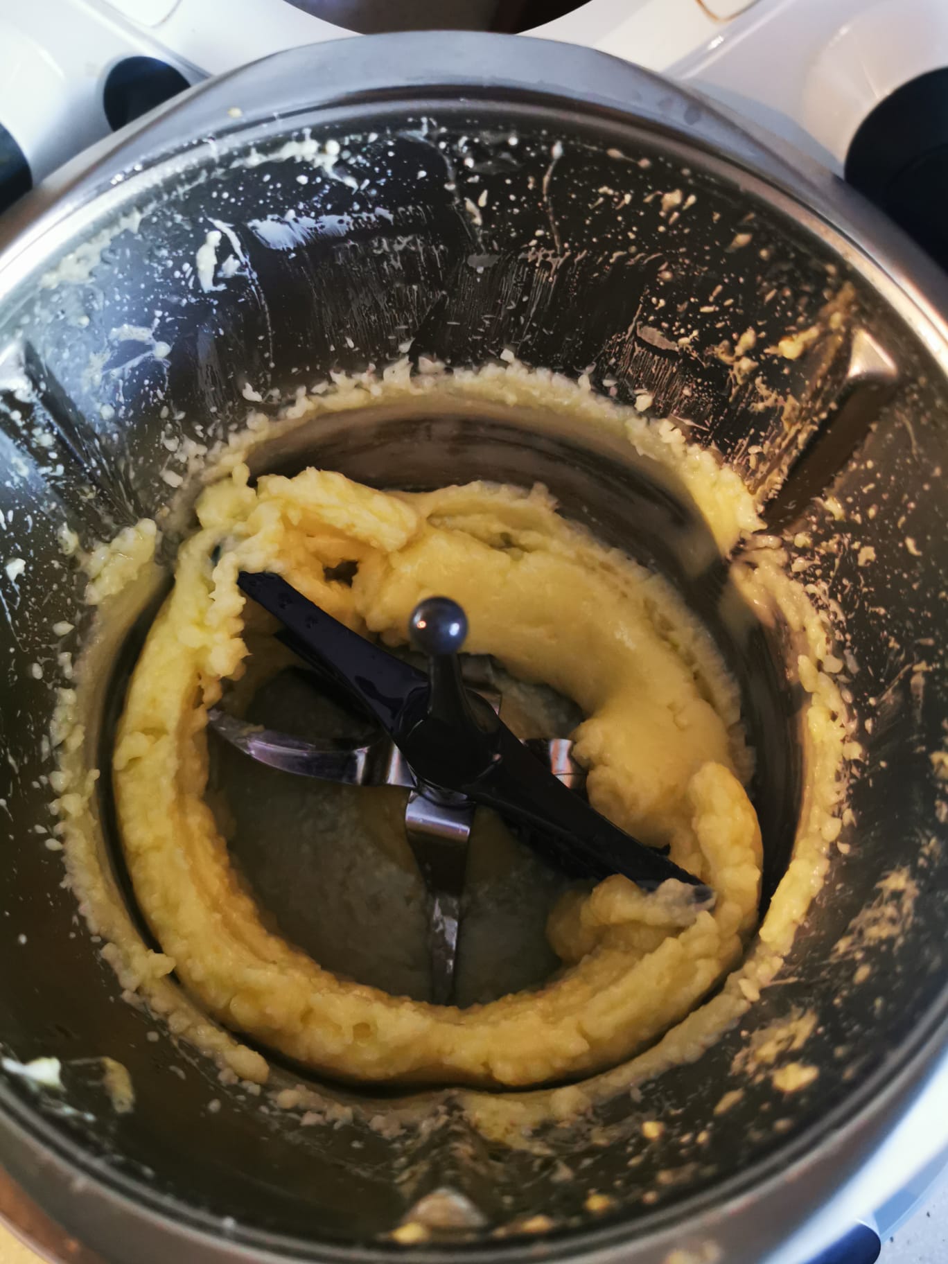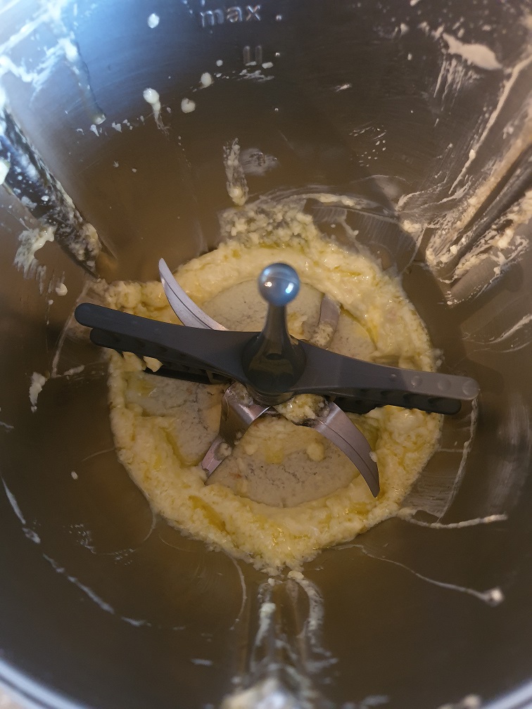 Otro punto muy importante es como vertemos el aceite. Tenemos que hacerlo de forma lenta y continua, consiguiendo un vertido a hilo. NO tenemos que levantar el cubilete, no tenemos que echar todo el aceite de golpe en la tapa, es mejor ir echando un poco y cuando se acabe, echar más. No tengáis prisa en que baje todo, porqué si baja muy rápido se cortará. La receta os dice que programéis 4 minutos para echar el aceite, pero si necesitáis más tiempo, programáis más sin problema.