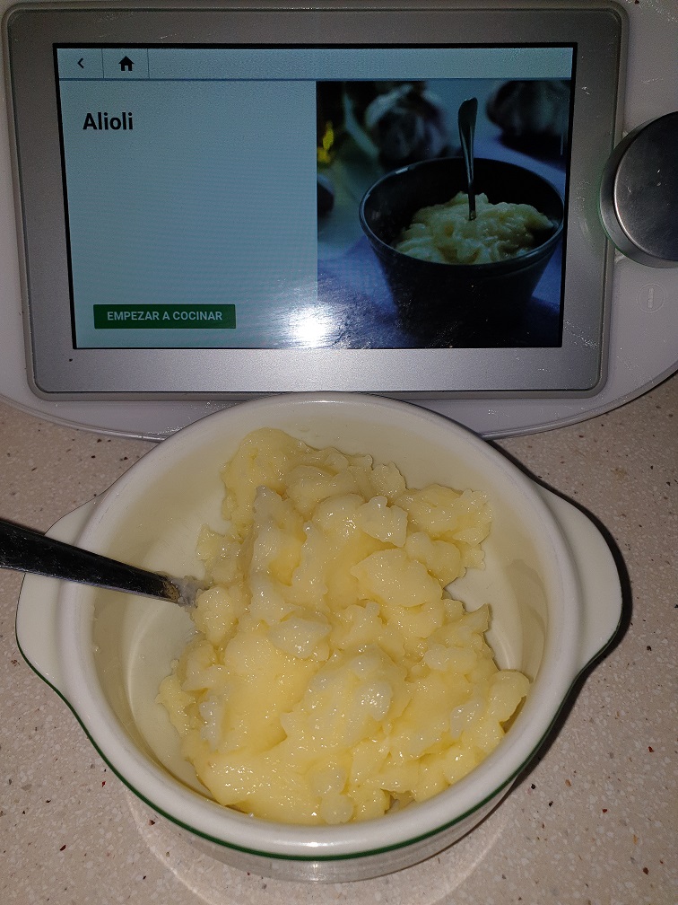 - Acabado el tiempo, programamos el Thermomix a Velocidad 4 y vamos añadiendo poco a poco el alioli cortado por el bocal, de esta manera lo habremos recuperado sin necesidad de echarle un huevo.