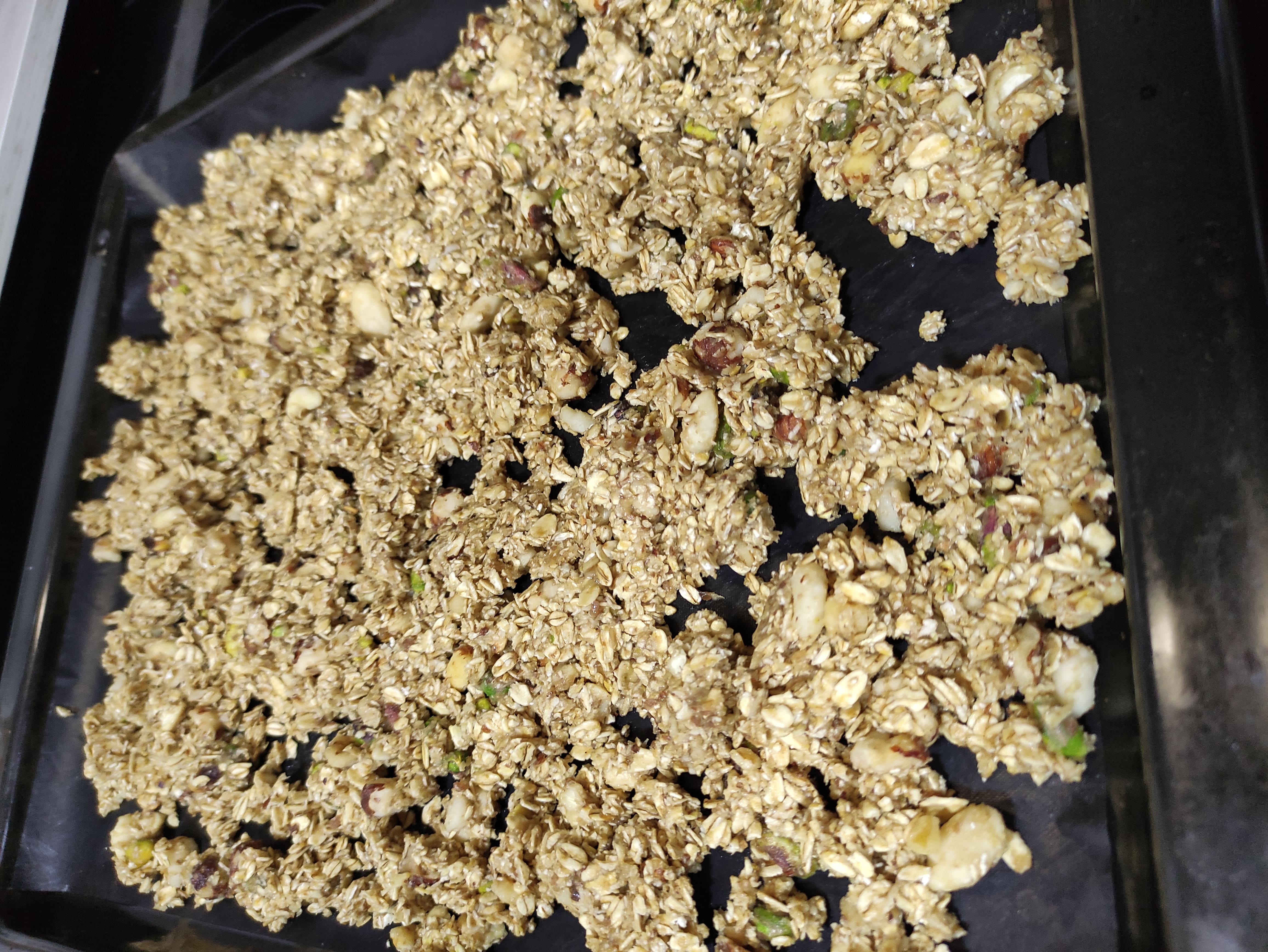 Afegeix els flocs de civada, els fruits secs i l'oli , barreja 30 seg // vel 4. Amb l'espàtula, esten la barreja en una safata de forn.