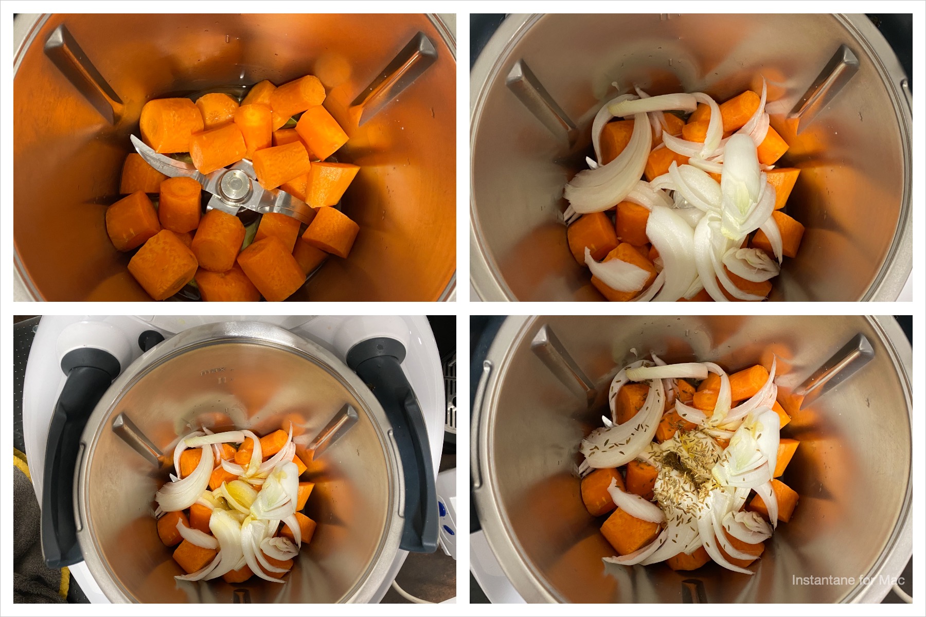 Ponga en el vaso el aciete de oliva, las zanahorias, la cebolla, el jarabe de agave, el comino y las semillas de cilantro molidas