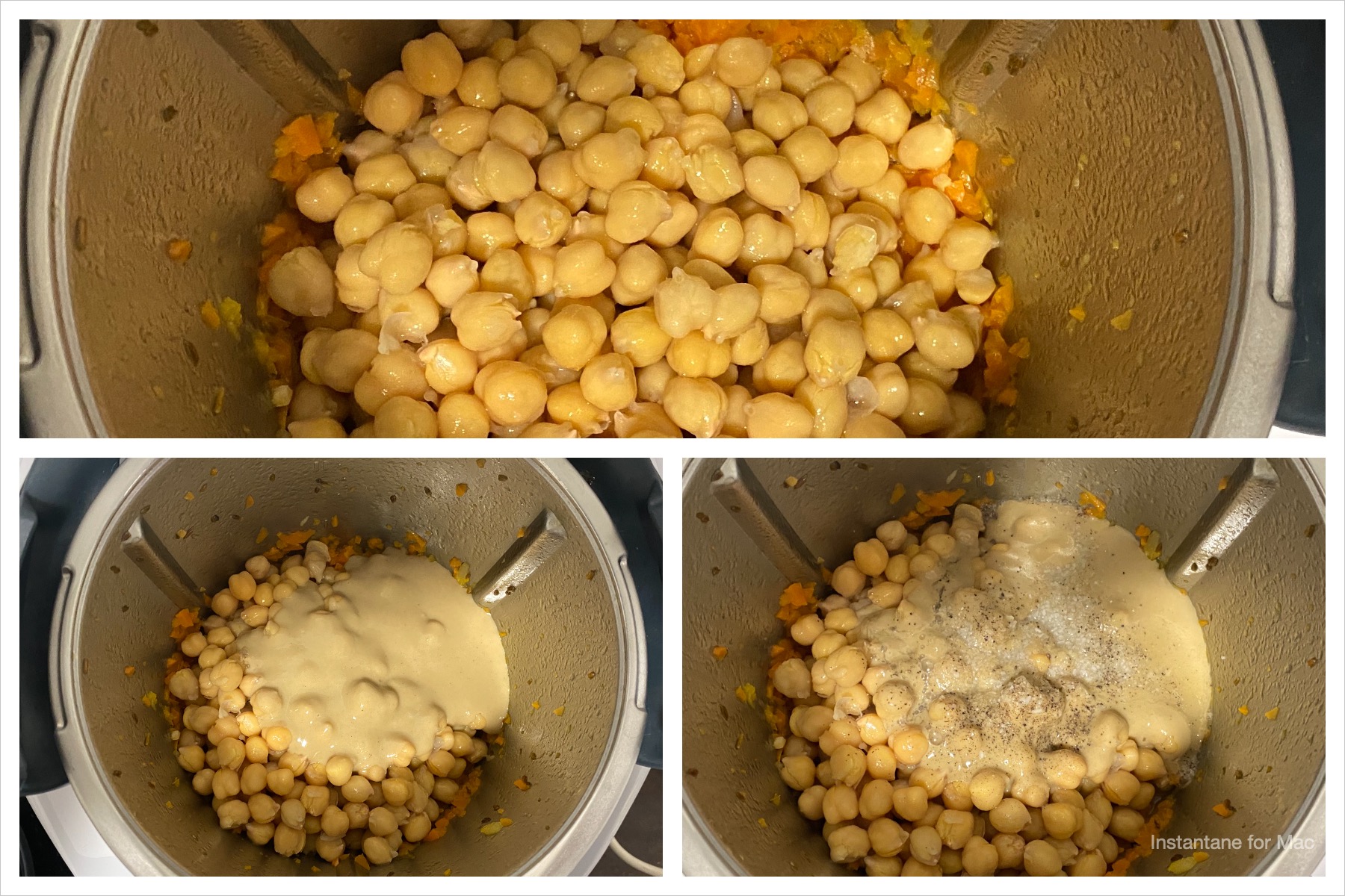 Añada los garbanzos, la tahini, la sal, la pimienta molida y el zumo de limón