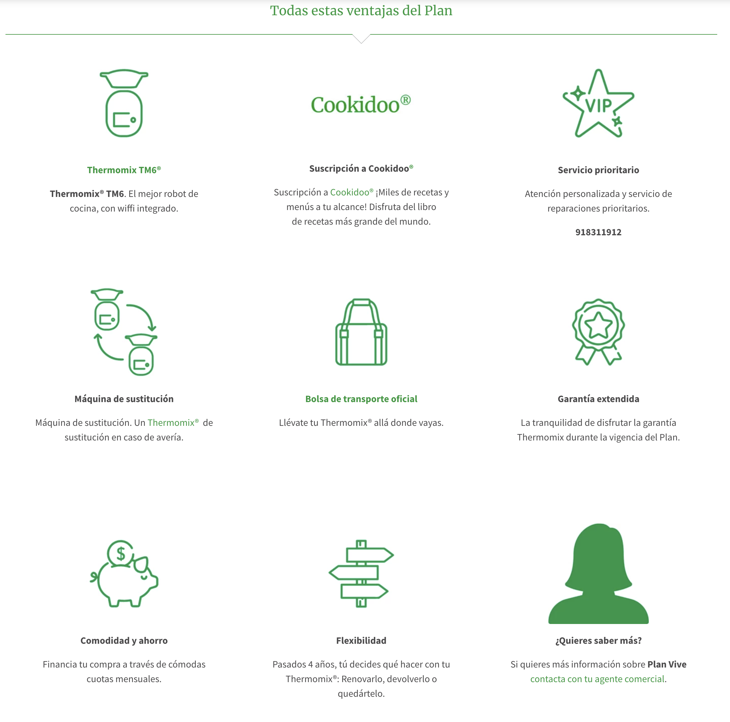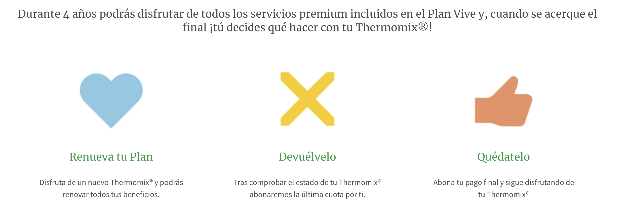 Hasta el 20 de febrero, Thermomix® te ofrece todas las ventajas exclusivas en un solo plan por menos de un euro al día y para que las disfrutes durante 4 años. Aprovecha los servicios premium y sácale todo el rendimiento a Thermomix® sin preocuparte de nada. El Plan Vive te aportará inspiración, agilidad y tranquilidad para lanzarte a por tus sueños.