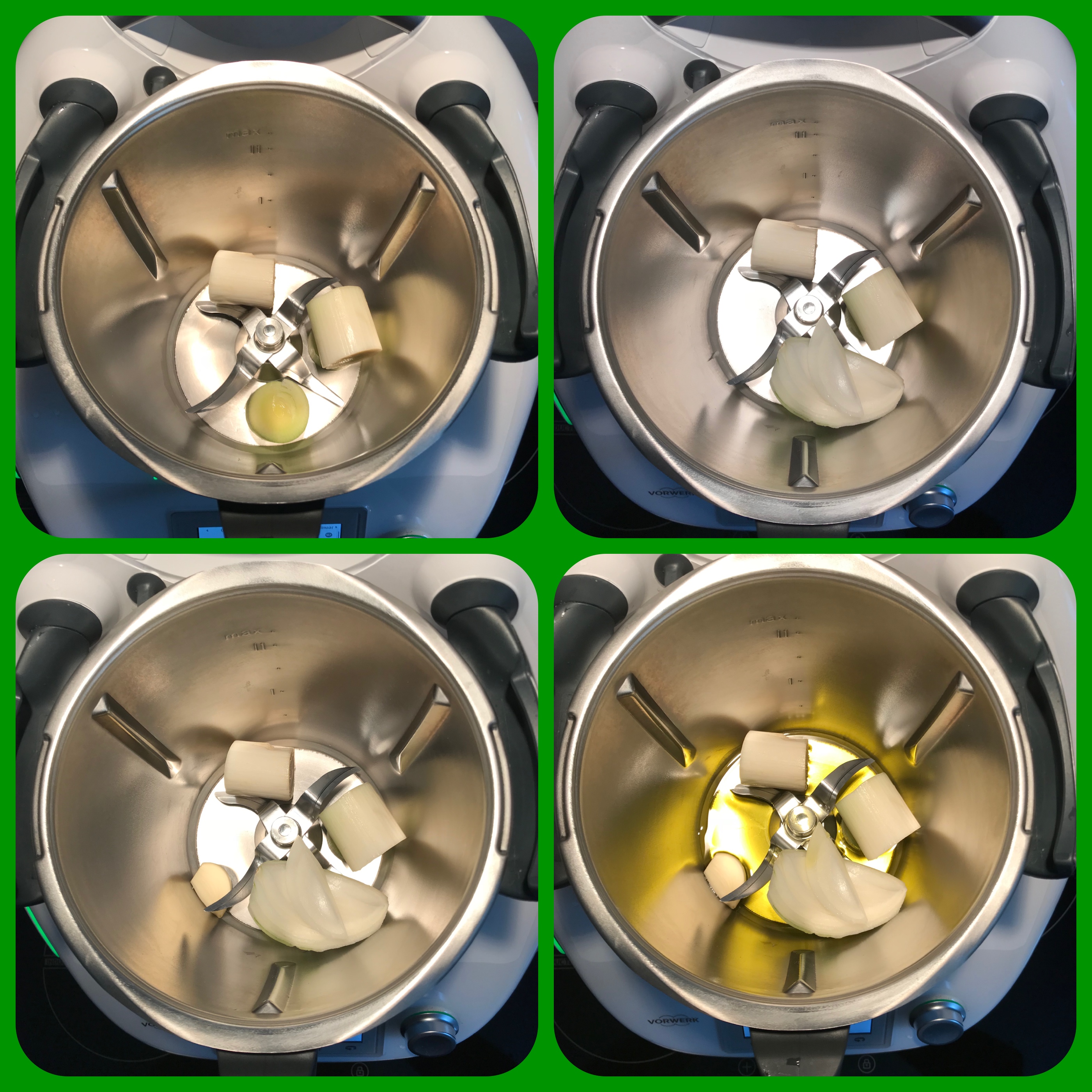 Ponga en el vaso el puerro, la cebolla, el ajo y el aceite.