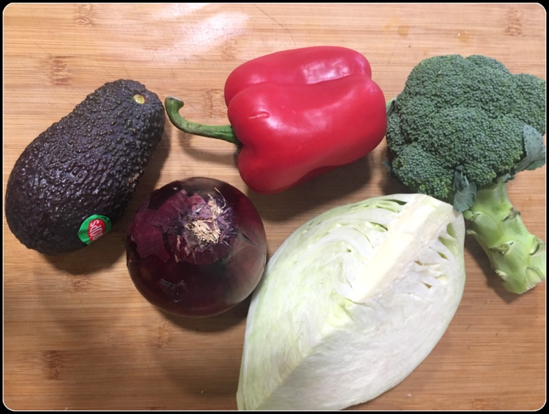 1.Poner el brócoli, la col, el pimiento, la cebolla en el vaso y trituramos 6 segundos a velocidad 4. Retiramos y reservamos en un bol, pelamos y cortamos el aguacate en dados y lo añadimos. a las verduras