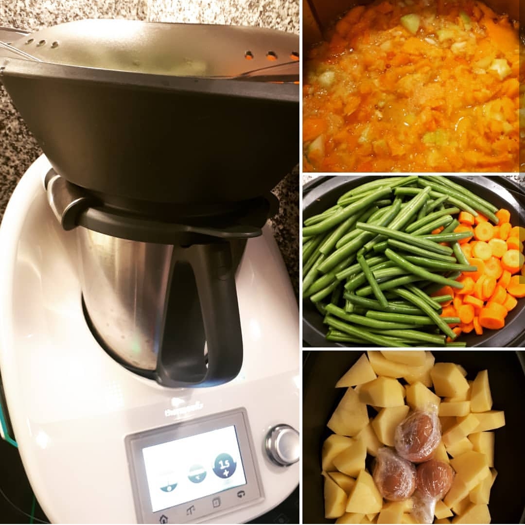 Sempre ensenyo als meus clients el gran avantatge de cuinar a nivells. Amb Thermomix ho podem fer gracies al seu recipient Varoma. Sempre que estiguem cuinat dins el got un menjar que tingui liquid o salsa podem aprofitar el vapor per cuinar algun altre aliment al recipient varoma.