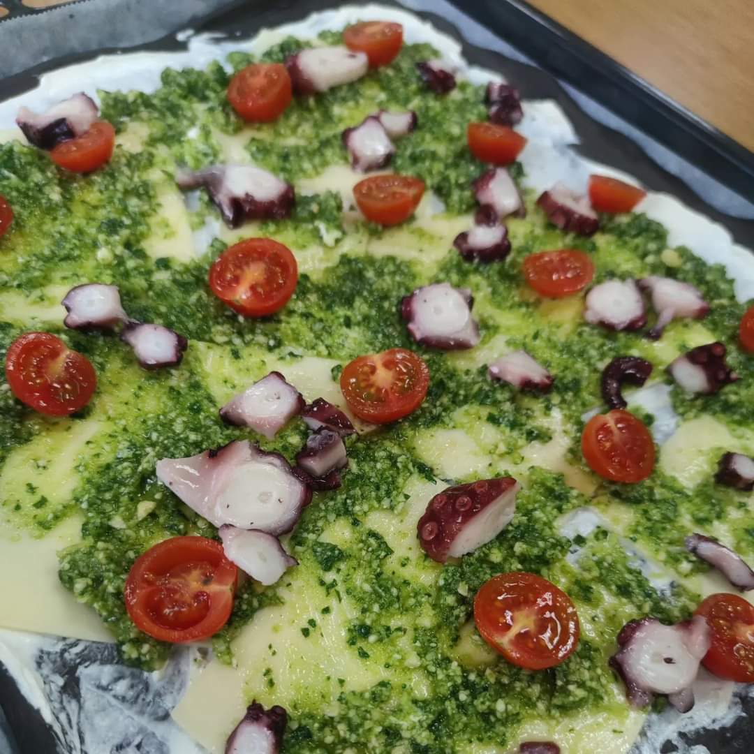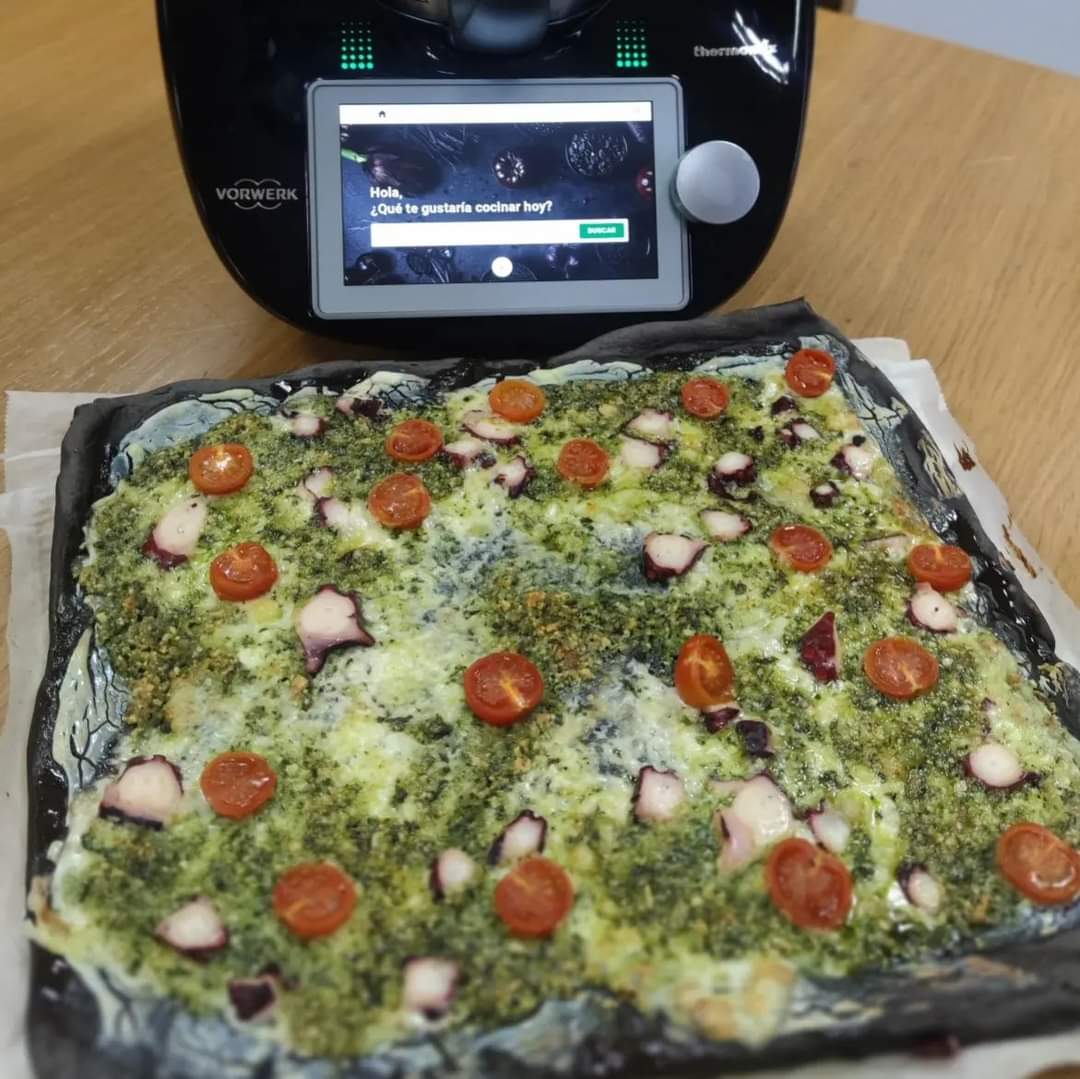 PIZZA NERO DI SEPIA CON PULPO Y PESTO DE ALMENDRAS