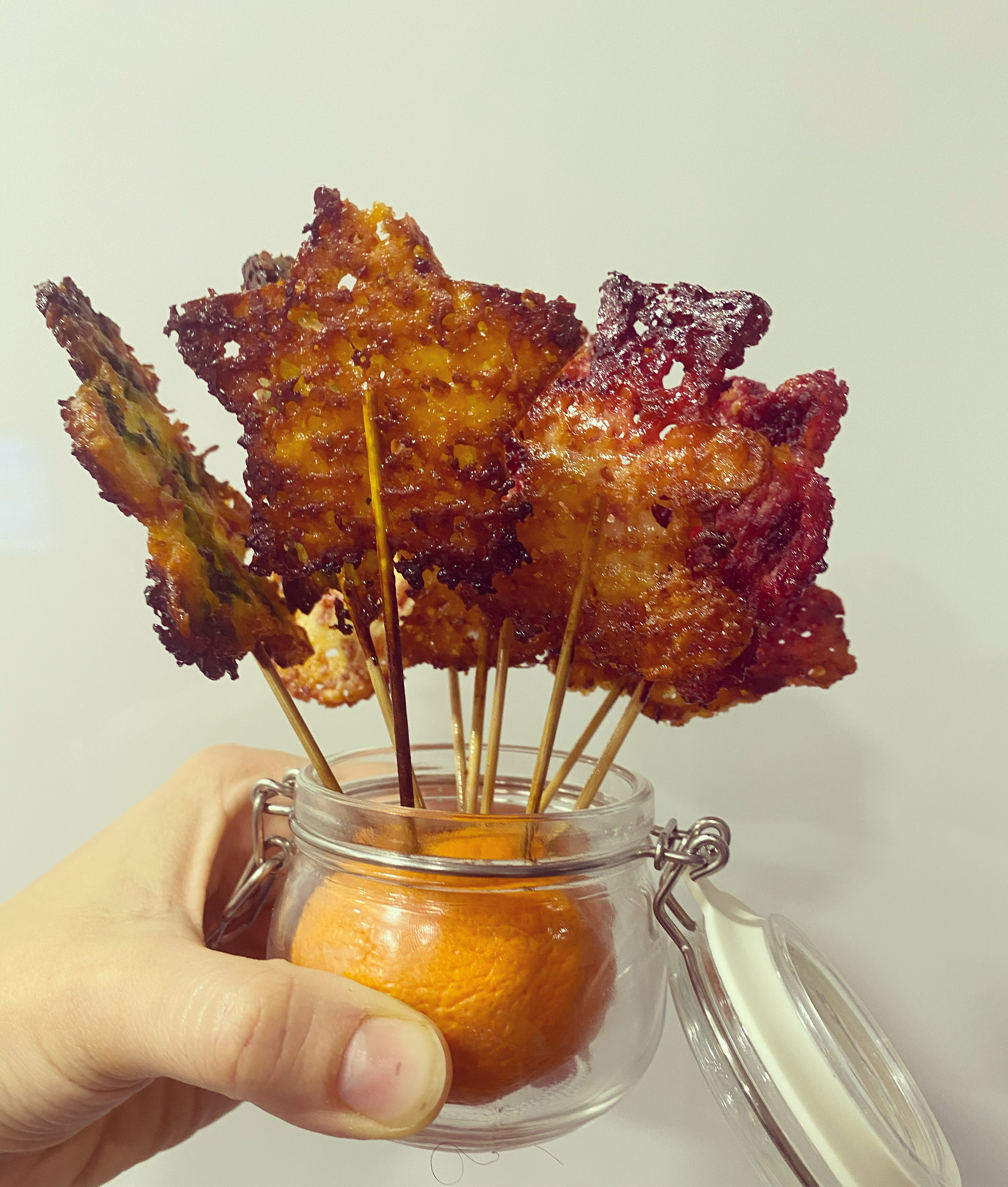 Els pinxos de fusta estan clavats a una mandarina, us agrada la presentació?