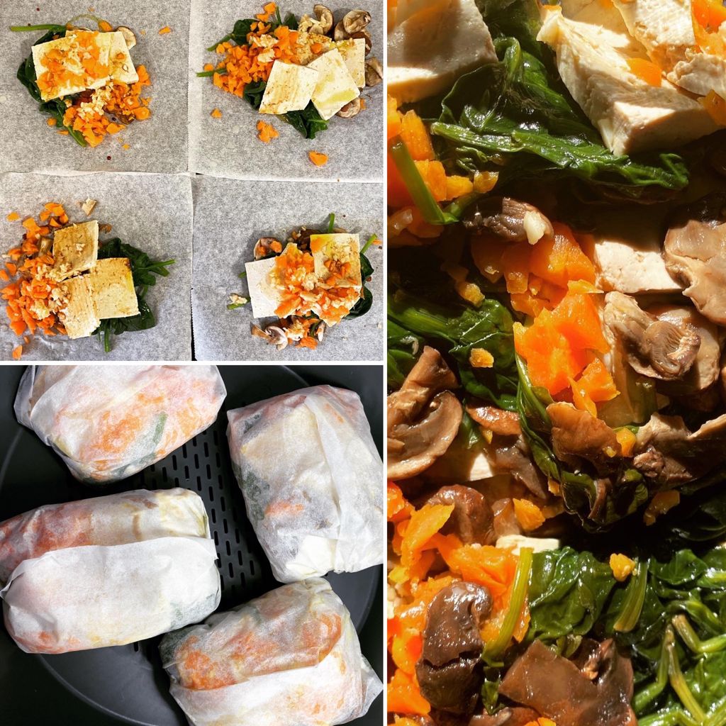 - Obre els papillots i talla el tofu en làmines i serveix amb les verduretes!