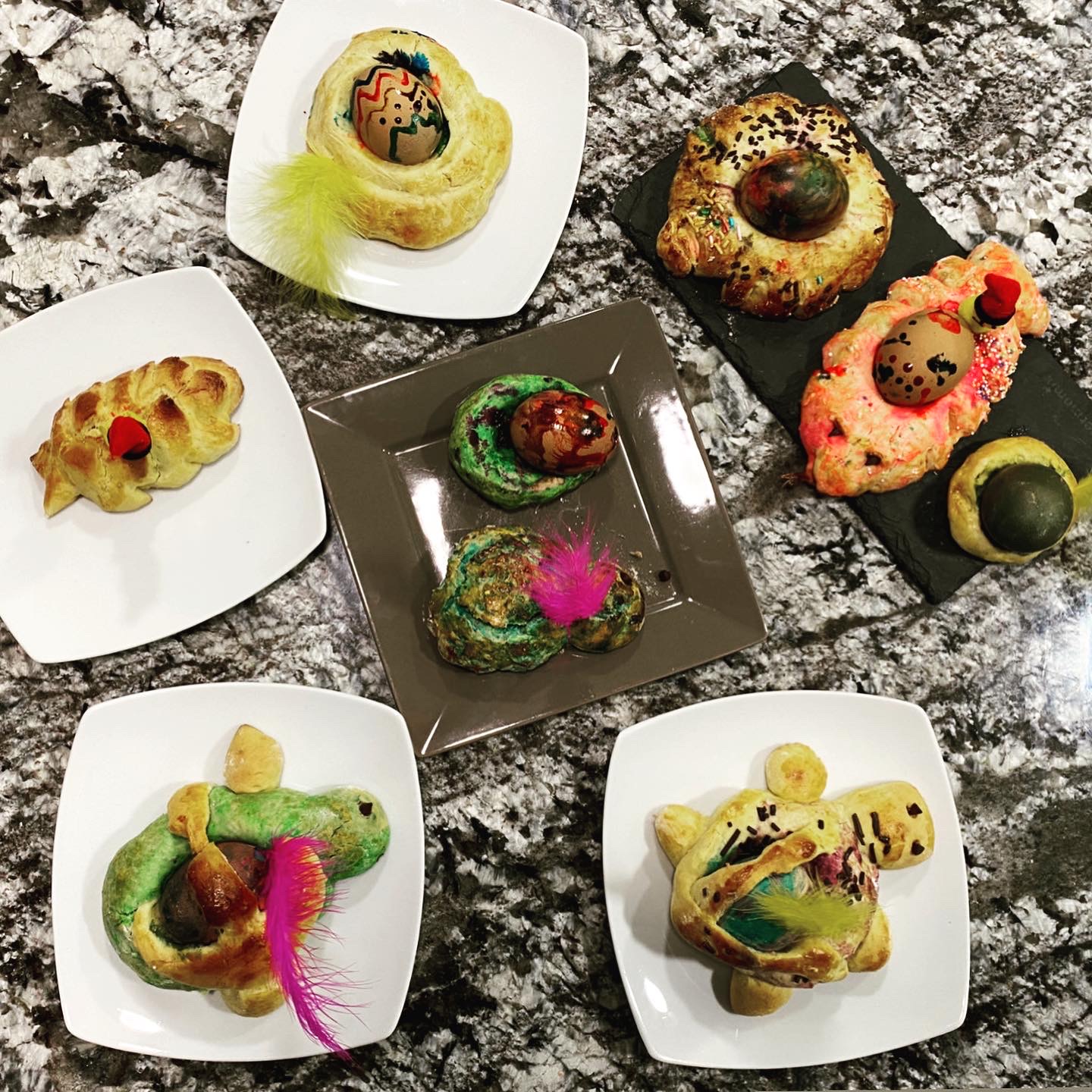 2. Amb la massa forma una bola, i després divideix-la en 10 porcions. Fes amb elles formes diferents (rodones, amb forma d’animals, etc.). Coloca-les a la bandeja de forn. Posa-hi a sobre de cada una 1 ou dur tenyit, pinta les formes amb ou batut i per sobre una mica de sucre glass. Deixa reposar fins que doblin el seu volum.