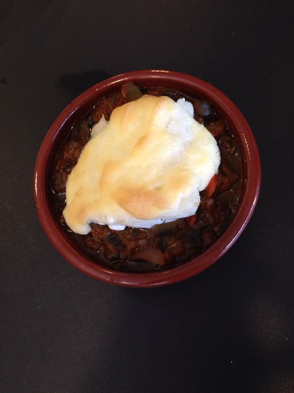 - Muntar el plat, posant una base de samfaina, el bacallà i una cullerada de muselina i enfornar (només gratinar). Ho podem fer en cassoletes individuals o en una safata gran.