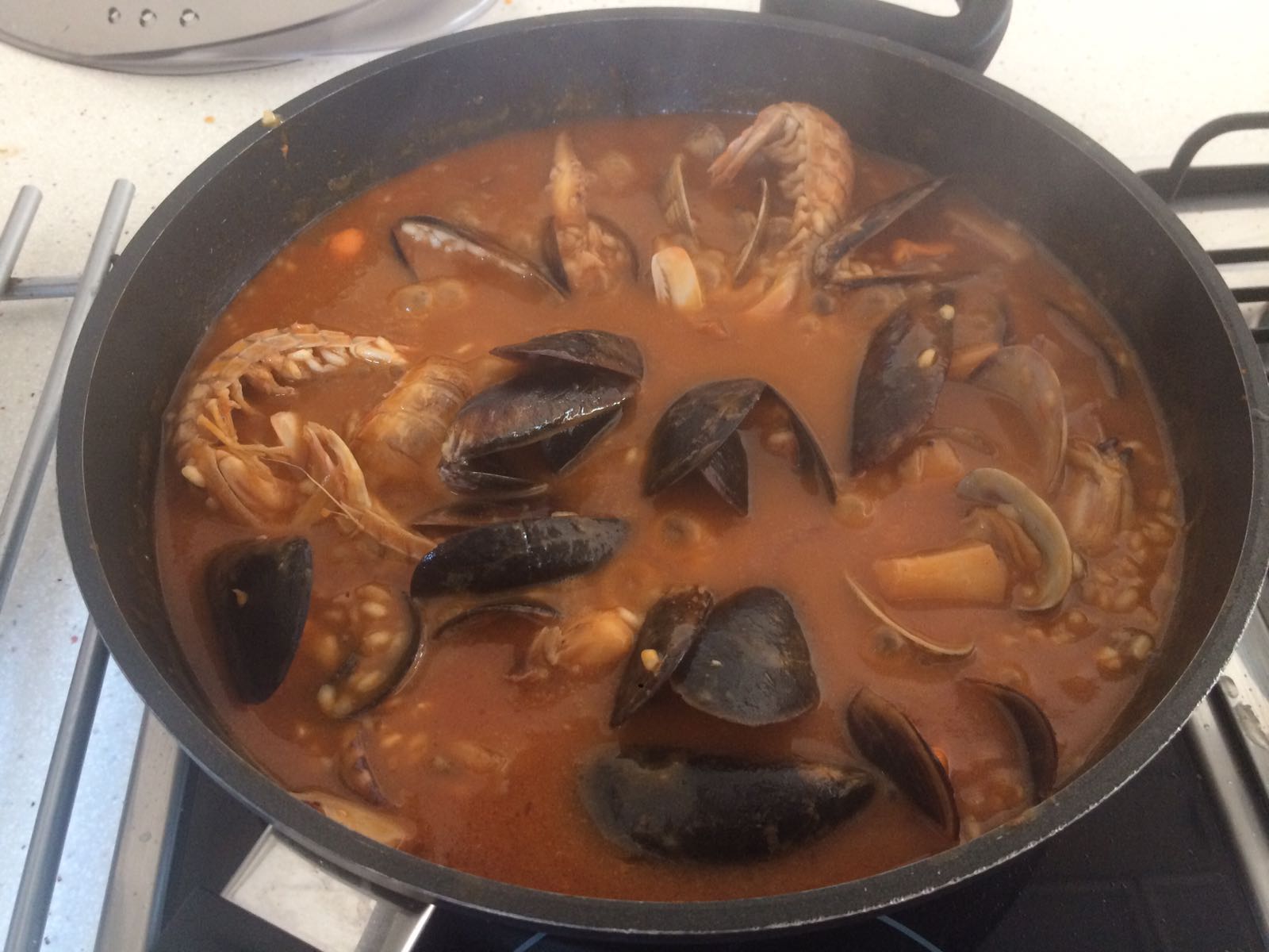 13. Posar-ho tot en una paella amb els musclos i les gambes i assecar-lo a foc fort durant 10’ (5’ a foc fort i 5’a foc més lent )