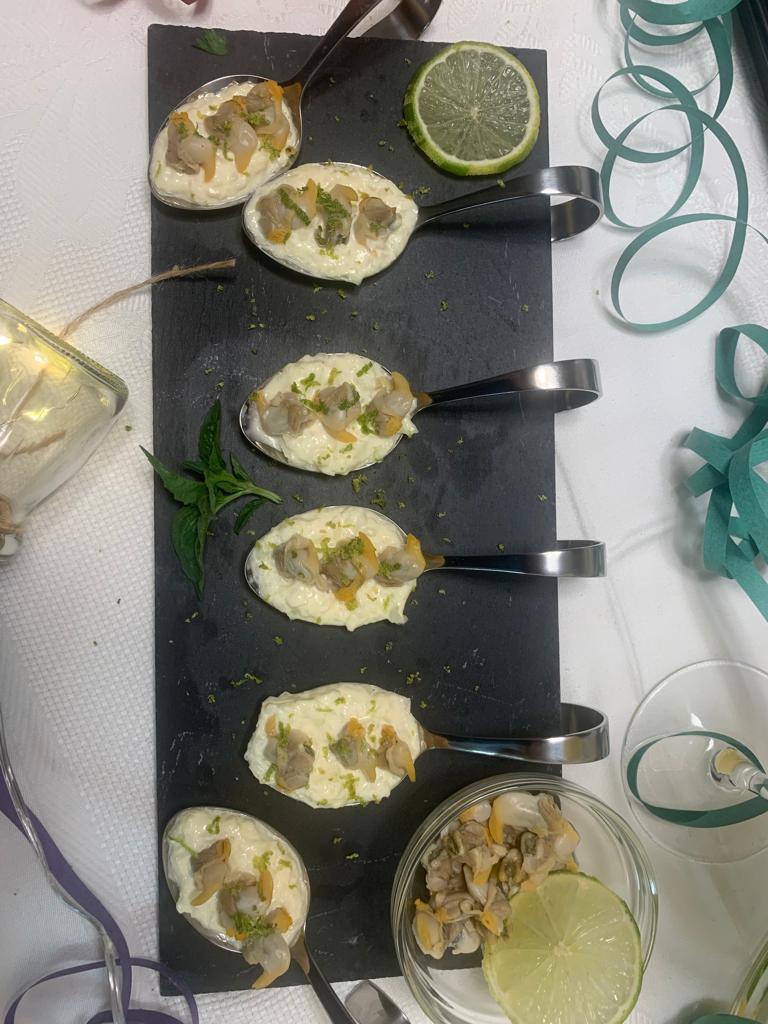 3. Servir sobre cada cucharita la mezcla. Añadir los berberechos y rallar lima por encima.