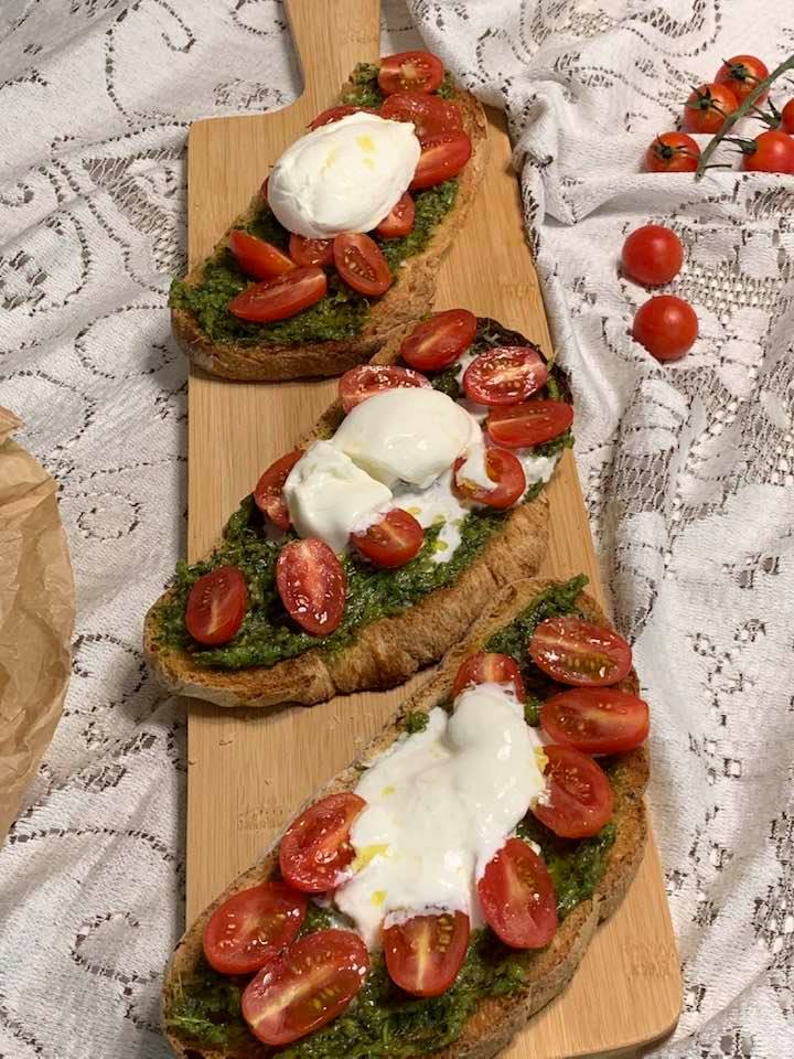 TOSTAS CON TOMATE CHERRY, BURRATA Y PESTO DE TALLOS DE ZANAHORIA