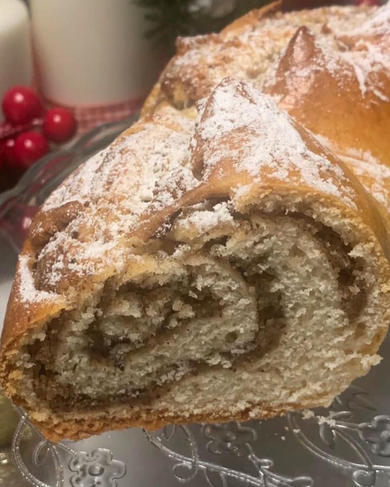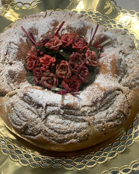 6️⃣. Extienda la masa con un rodillo, hasta obtener un rectángulo de aprox. 40 x 50 cm (puede hacerlo entre 2 plásticos) Cúbrala con el relleno y forme un rollo de 50 cm de largo. Coloque el rollo de masa en forma de círculo sobre una bandeja de horno cubierta con papel de hornear y hágale unos cortes profundos en forma de triángulos de modo que se vea el relleno. Mezcle en un bol la yema de huevo restante con la leche y pincele la corona. Hornee a 180º C durante 30-35 minutos.