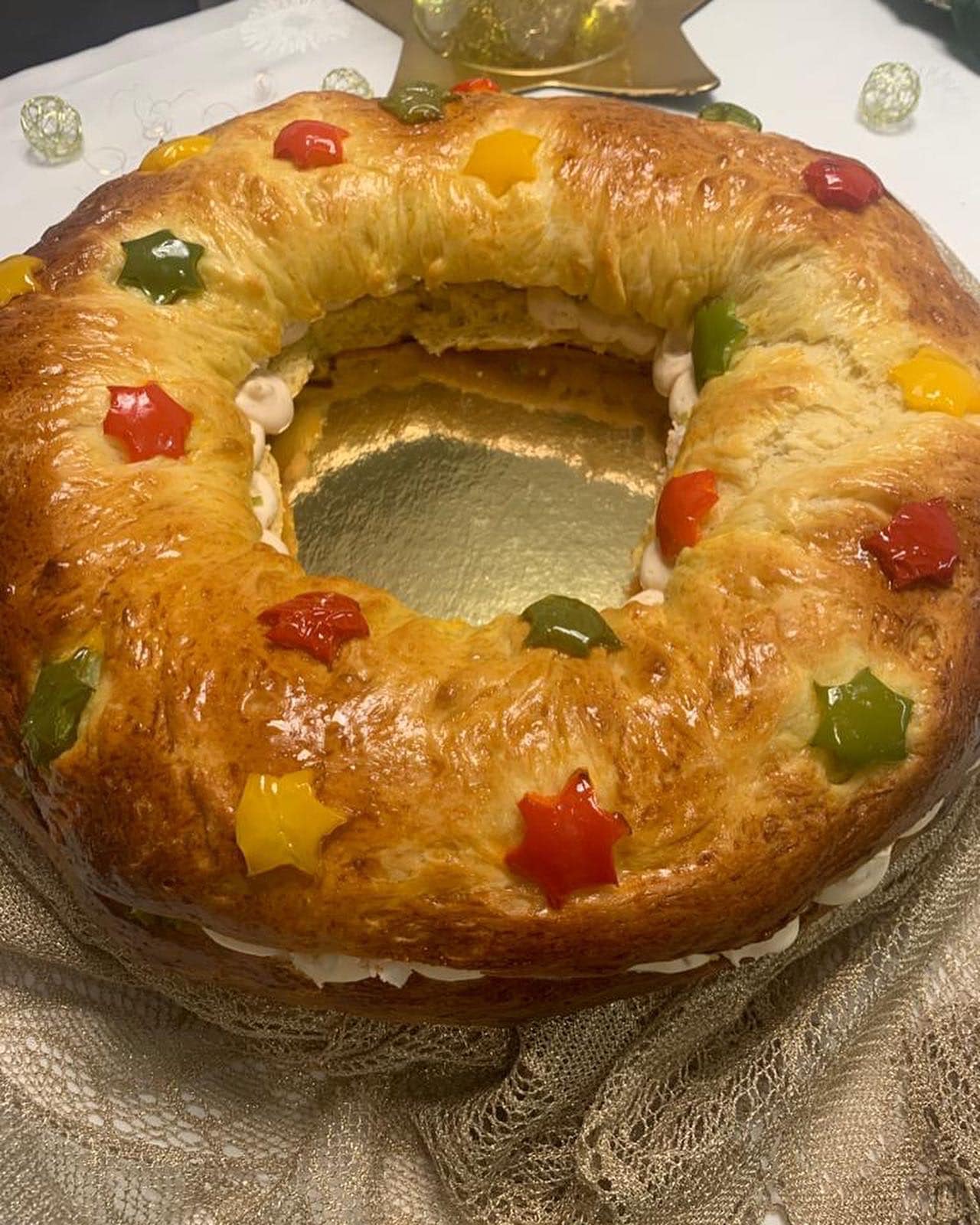 NOTA: Queda muy original si decoráis el roscón con unas estrellas de pimiento rojo, verde y amarillo.Son muy fáciles de hacer, solo tenéis que disponer de un cortador de galletas en forma de estrella. La receta la encontraréis en cookidoo.
