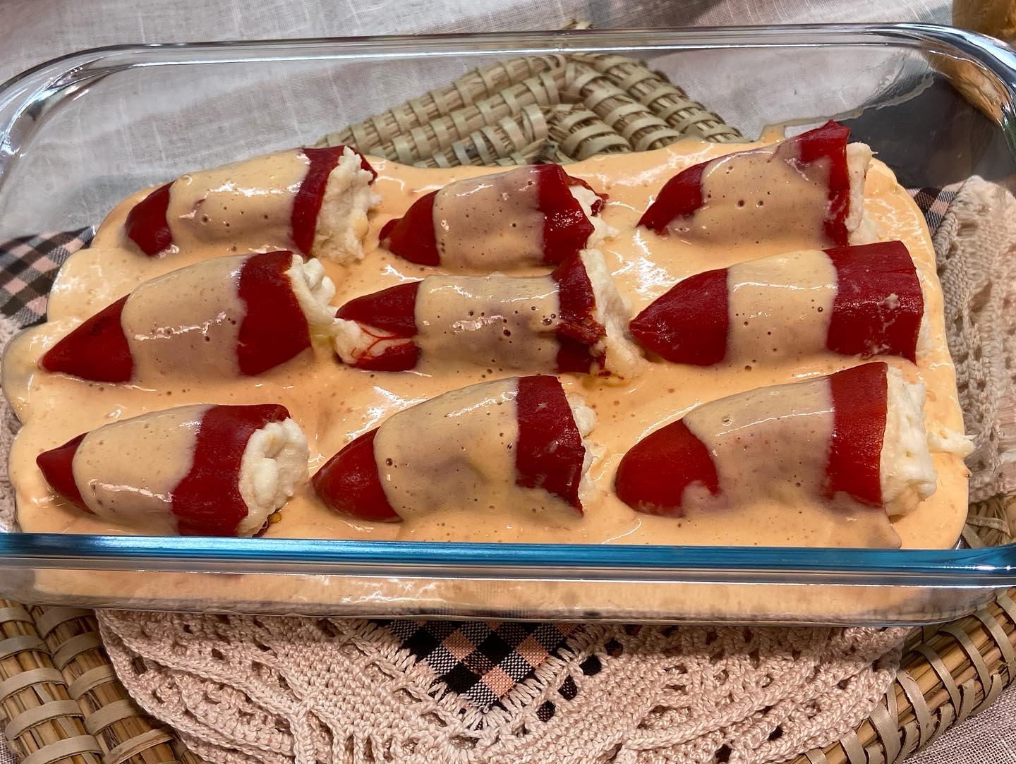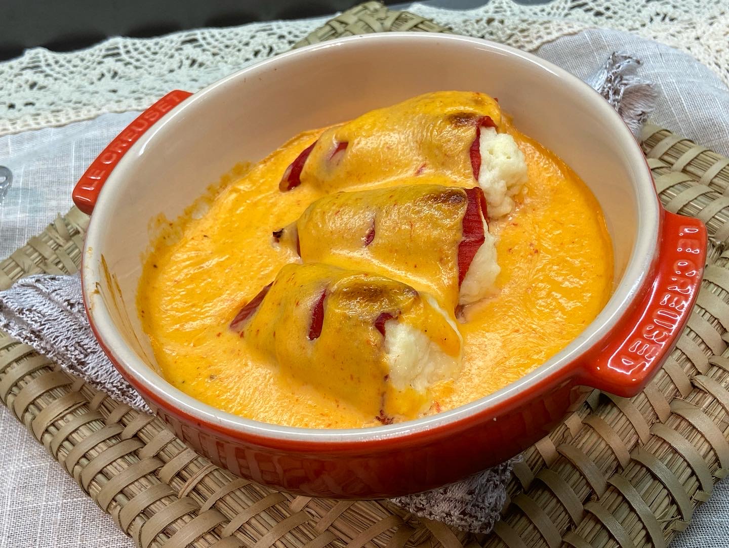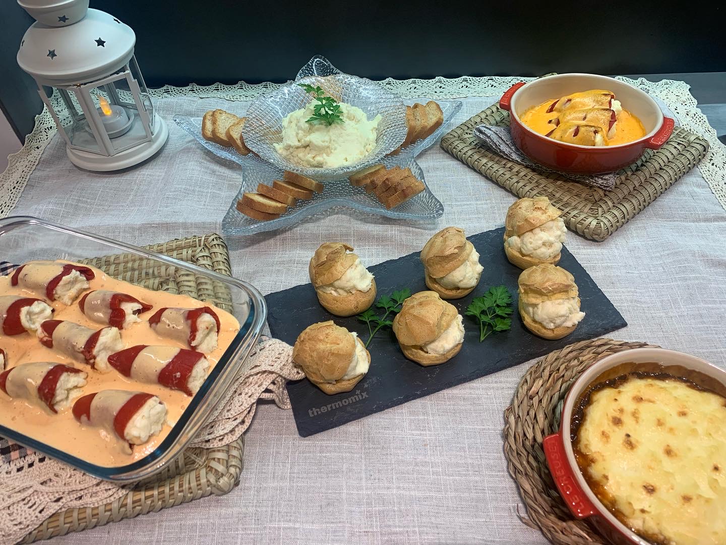 La primera foto és el resultat del directe que vaig fer des del facebook de la Delegació . Els plats que vaig preparar van ser: pebrots del piquillo farcits, lioneses farcides i gratinada amb un llit de pebrot confitat.