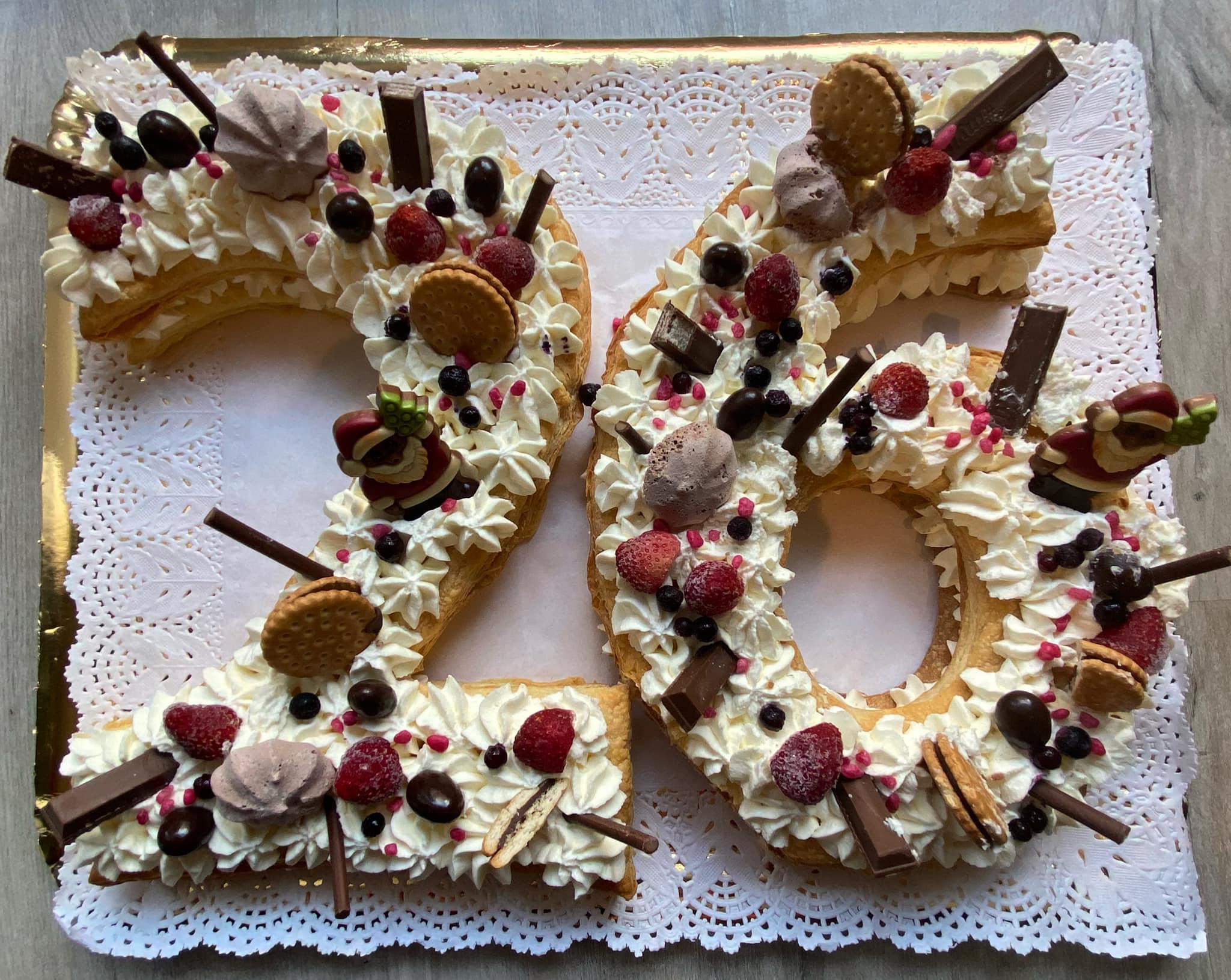 Mireu quin pastís d'aniversari vaig fer la setmana passada! Està fet amb pasta de full i està farcit amb nata. Vaig tallar la pasta de full amb la forma dels números i la vaig fornejar. Els números els vaig fer dobles perquè així tingués una base i després un altre a sobre. Un cop vaig tenir tot això preparat va ser quan vaig farcir-lo de nata.