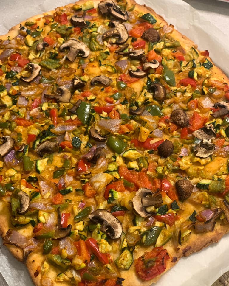 5️⃣. Cubra la masa con las verduras y déjelo en reposo unos minutos. Puede añadir unos champiñones laminados, espárragos verdes etc .Hornee la coca durante 20 minutos a 200°.