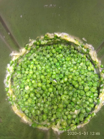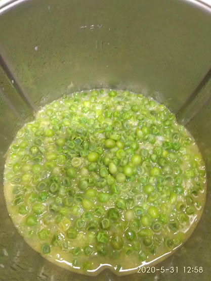Incorpore los guisantes y sofría 7 min/120°C/vel 1. Retire 6 cucharadas de guisantes y reserve para servir.
