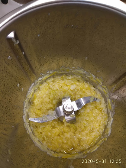 Ponga en el vaso la cebolla, el puerro, el aceite y la sal. Trocee 3 seg/vel 5 y sofría 10 min/120°C/vel 1.